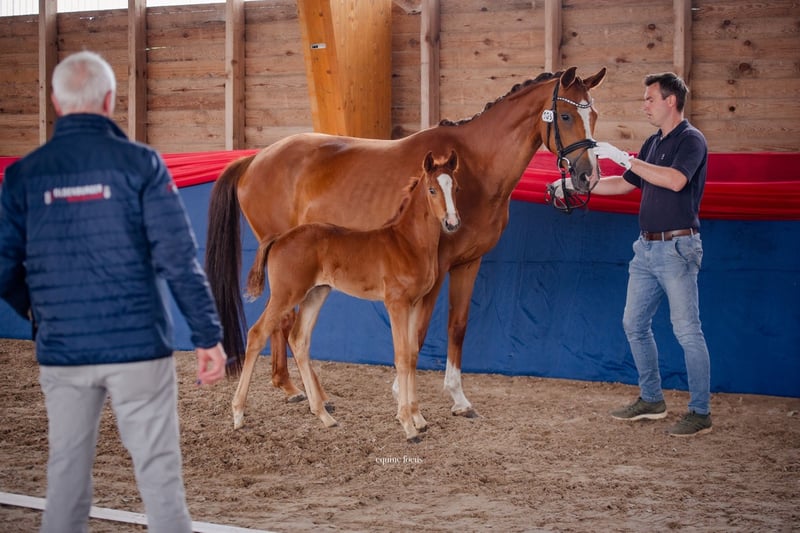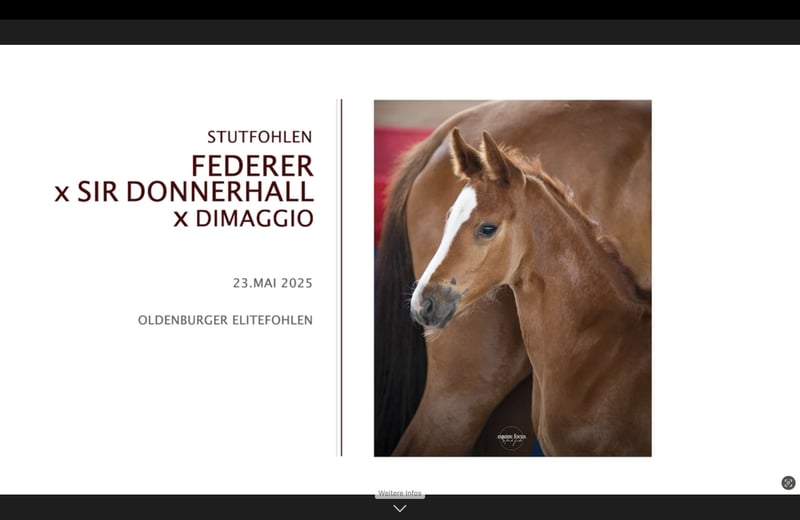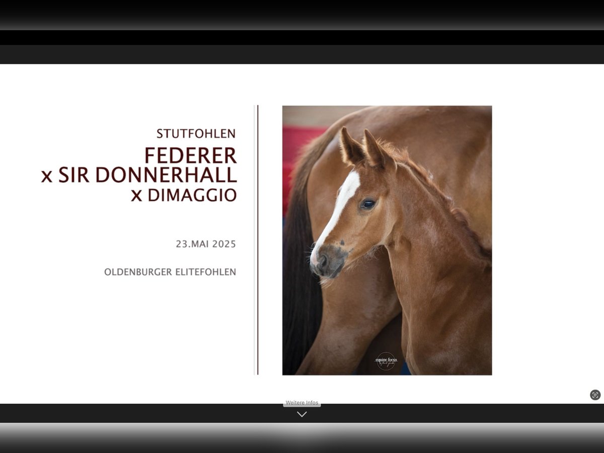 Noble Oldenburg Filly with Elite Award – Movement, Type & Perspective Charm, movement, and nobility – this little lady attracts all eyes. We offer an exceptionally type-strong Oldenburg filly from modern dressage lineage. Just a few weeks after her birth, she was awarded the title of Oldenburg Elite Foal 2025 at the foal show on June 19, 2025 – a designation given only to foals of outstanding quality in type, conformation, and movement. Her mother, SilentThunder, was also honored at the show as an Oldenburg Verband Premium Mare – further evidence of the breeding power of this line. Date of Birth: May 23, 2025 Award: Oldenburg Elite Foal 2025 Pedigree: ➡ Sire: Federer (by Farrell – Livaldon) – Winner of the Oldenburg Main Premium 2023 ➡ Dam: SilentThunder (by Sir Donnerhall I – DiMaggio) – from a proven Grand Prix line Movement & Appearance: The filly impresses with clear rhythm, significant knee action, and a remarkably elastic movement flow. Especially in the trot, she demonstrates reach, freedom of the shoulder, and a distinct overstep. In the walk, she also scores with inner calmness and generous overstep. The foundation is correct and refined, and the body is harmonious and typy. Character: Curious, clear-headed, and people-oriented – a foal with natural presence and inner tranquility. Ideal for ambitious riders, breeders, or discerning leisure horse enthusiasts with an eye for quality. Maternal Line: From the direct mother La Martina come, among others: – the licensed Oldenburg stallion For Final – as well as the sport-successful dressage horse Flashdancer 9 Both impressively carry forward the breeding power of this line. Location: Fehrbellin
