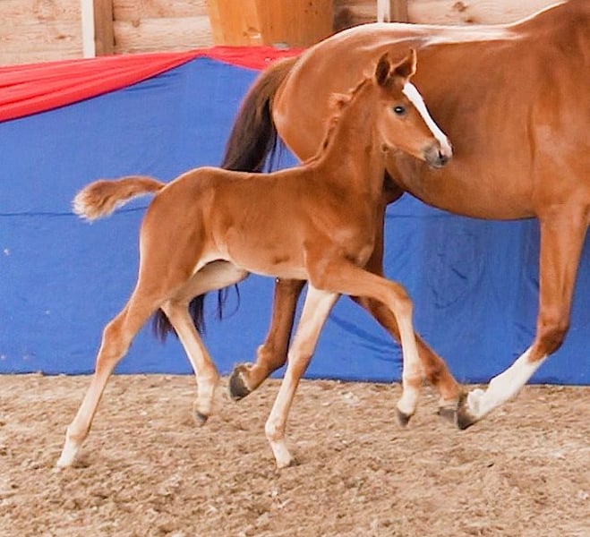Edles Oldenburger Stutfohlen mit Elite-Prämierung – Bewegung, Typ & Perspektive Charme, Bewegung und Adel – diese kleine Dame zieht alle Blicke auf sich. Wir bieten ein außergewöhnlich typstarkes Oldenburger Stutfohlen aus moderner Dressurabstammung. Bereits wenige Wochen nach der Geburt wurde sie bei der Fohlenschau am 19. Juni 2025 als Oldenburger Elitefohlen 2025 ausgezeichnet – ein Prädikat, das nur an Fohlen mit herausragender Qualität in Typ, Exterieur und Bewegung vergeben wird. Auch ihre Mutter SilentThunder wurde im Rahmen der Schau als Oldenburger Verbandsprämienstute geehrt – ein weiterer Beleg für die Vererbungskraft dieser Linie. Geboren: 23. Mai 2025 Prämierung: Oldenburger Elitefohlen 2025 Abstammung: ➡ Vater: Federer (v. Farrell – Livaldon) – Sieger der Oldenburger Hauptprämie 2023 ➡ Mutter: SilentThunder (v. Sir Donnerhall I – DiMaggio) – aus bewährtem Grand-Prix-Stamm Bewegung & Auftreten: Das Fohlen besticht mit klarer Taktgebung, viel Kniemechanik und einem auffallend elastischen Bewegungsfluss. Besonders im Trab zeigt sie Raumgriff, Schulterfreiheit und einen deutlichen Überschritt. Auch im Schritt punktet sie mit innerer Ruhe und großzügigem Übertritt. Das Fundament ist korrekt und fein, der Körper harmonisch und typvoll. Charakter: Neugierig, klar im Kopf und menschenbezogen – ein Fohlen mit natürlicher Präsenz und innerer Gelassenheit. Ideal für ambitionierte Reiterinnen, Züchterinnen oder anspruchsvolle Freizeitpferde-Liebhaber*innen mit Blick für Qualität. Mutterlinie: Aus der direkten Mutter La Martina stammen u. a. – der gekörte Oldenburger Hengst For Final – sowie das sporterfolgreiche Dressurpferd Flashdancer 9 Beide tragen die Vererbungskraft dieser Linie eindrucksvoll weiter. Standort: Fehrbellin