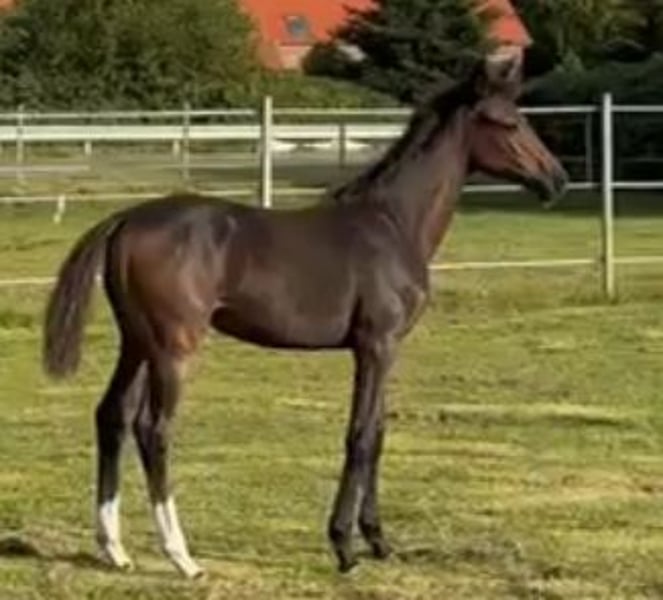Stunning Filly by Danciero × Fürst Jazz/Blue Hors Romanov for Sale! Born on May 12, 2025, this charming dark bay filly with two white socks has already captured attention. She impresses with excellent basic gaits, an elegant presence, and a friendly, curious nature—an aspiring dressage horse with great potential for the future. ✨ Well-built – correct conformation – eager to perform ✨ Pedigree: Danciero × Fürst Jazz/Blue Hors Romanov ✨ Raised in a herd, in a natural and loving environment 📹 Videos available upon request! 👉 This special foal is now looking for a new home and caring hands to nurture her talents. #Danciero #FurstJazz #DressageFoal #Filly #DressageHorse #Foal2025 #DressageProspect #Breeding #FutureStar #YoungChampion #FoalLover #FoalForSale