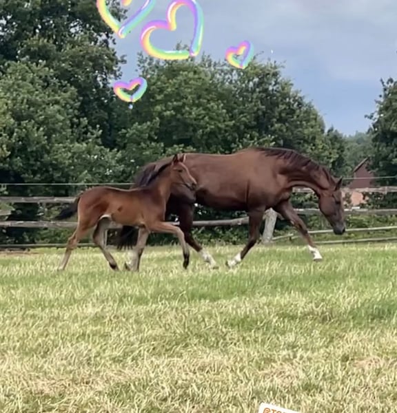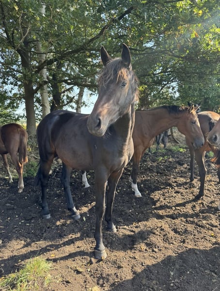 Extremely typy and beautiful For Kingdom-Quaterback - Donnerhall mare for sale. Both her mother and grandmother have been ridden themselves and are manageable for amateurs. The sire, For Kingdom, was the winner of the 2022 and 2023 sport tests in Verden with outstanding scores (9.05!), including top marks for rideability (9.8), and has already been placed in S-level competitions in 2025. For Kingdom's dam, Woodlander Dornröschen (successful at Grand Prix), is also the dam of the double world champion Woodlander Farouche. The sire of For Kingdom, For Emotion, was ranked number 1 among stallions based on breeding values at the 2025 young horse performance tests. The success of Quaterback, Donnerhall, and their progeny is well known. The mare has an active hind leg and three very good basic gaits. Her dam is available for viewing. Her half-brother on the dam's side is successful in sport; a half-brother from 2025 has been sold to a renowned stallion breeder. She is also very interesting for breeding purposes. The video shows her being led directly from the box into the arena. Current height approx. 1.67 m. She will turn 3 years old in May. Only being sold due to her potential as a broodmare. A good X-ray examination from February 2026 is available. Directly from the breeder.