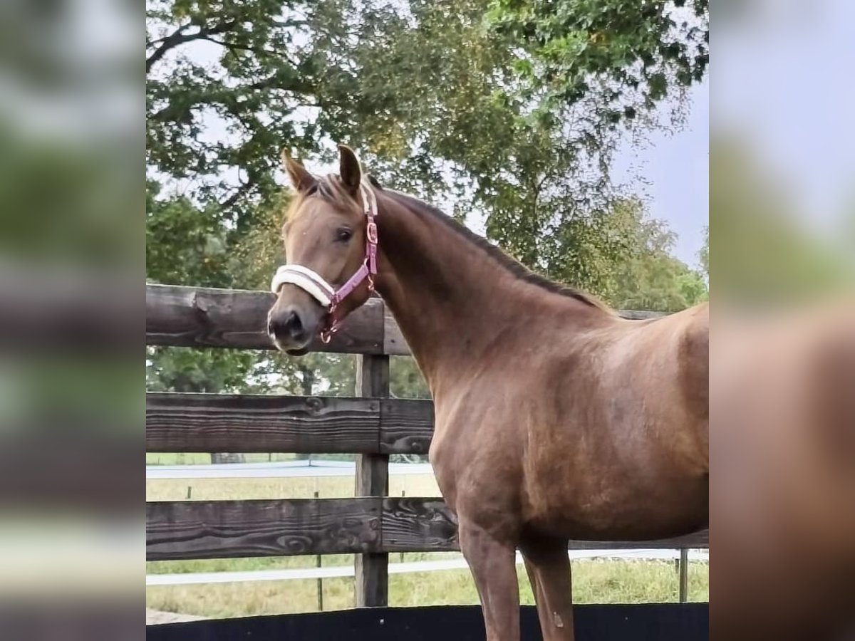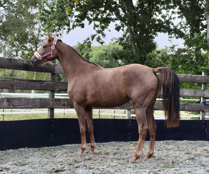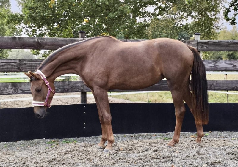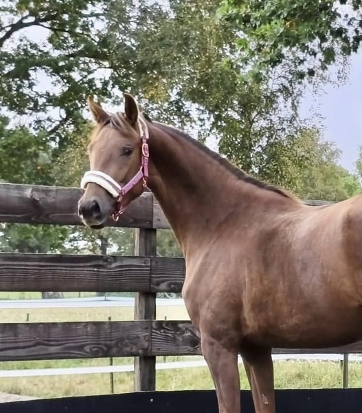 Beautiful, unbroken mare Dark chestnut Born April 20, 2023 (2.5 years old) Current height: 16.1 hh Premium foal award recipient Dynamic Dream x StPrSt Quantensprung x Caprimond x De Niro 👉 From the Caprimond dam line of Zonik Plus – winner in the Grand Prix Special at CHIO Aachen 2025🥇 Dam: Quantensprung x Caprimond x De Niro 👉 State premium mare with an overall mare performance test score of 8.4!!! Breeding evaluation 6/7. The dam was auction top at Klosterhof Medingen as a foal (€38,000). Sire: Dynamic Dream (Dream Boy – Sir Donnerhall I) Winner of the Westphalian licensing (€1.9 million) and HLP champion in Denmark. Owned by Helgstrand Dressage. Dynamic Dream is one of the most sought-after sires of his generation across Europe. His progeny includes numerous licensed sons and auction toppers like Dynamic Heart (€90,000) and Dynamic in Black (€74,500). Dam line: Oldenburg line 140 / Majorin III (by Graf – Gaudy – Gessler – Falko – Macro) – Day and Night by De Niro (Grand Prix, Bianca Ramcke) – Elite Quality Time by Quantensprung (S**, Jaya Gutheil) – Macron by Morricone I (S*, Julia Schönherr) – Quel Plaisir by Quantensprung (M**, Jens Harig, MS-Handorf 2016) – Million Dollar Baby by Millennium (M**, Jessica Nikolay) – Zacchiato by Zackerey (L, VA 2022) – OLHPrA Mirabelle by Escamillo (L) – Dodilas by Danone II (L, VA 2011) – Dauntless by Danone I (L) – Led Zeppelin by Looping (show jumping 1.40 m, Richard Kummer) – Luna by Luxius (show jumping 1.30 m, Kerstin Ilbertz) – Pik Loverboy by Pik Bube I (show jumping M, Wilhelm Brechters) Performance-tested stallions: Beniro (PB Oldenburg), Cabinett (Ldb. Moritzburg), Clever and Smart (Ldb. Zweibrücken, PB Westf.), Compagnon (PB Mecklenburg), First Promise (PB Netherlands), Friedo (PB Oldenburg), Fugato (PB Baden-Württemberg), Gordius, Inpello (PB Oldenburg, RhPfS), Lindgren, Lurioso (PB Westf.), Zico (PB Denmark, Oldenburg) International show jumpers: Atlantis 131 / Sven Schlüsselburg Cat Ballou 8 / Heinrich-Hermann Engemann Santander S / Angelica Augustsson (SWE) Farrier, dewormed, everything as it should be, sound, excellent character, human-oriented. Please feel free to contact me via private message if interested.