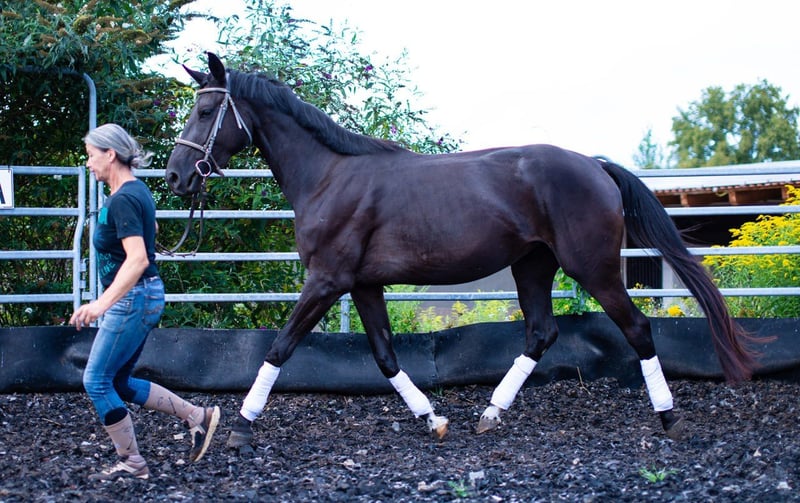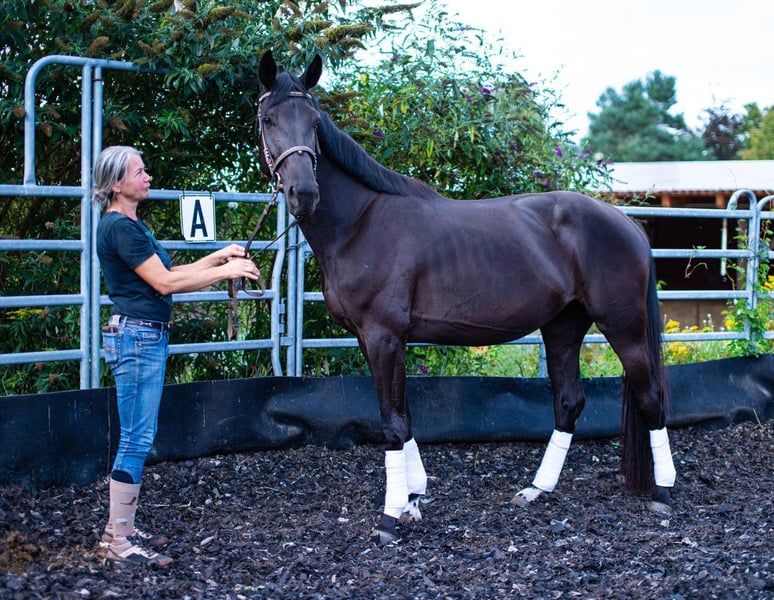 Die 3 jährige „Ladana“ entstammt einer kleinen aber erfolgreichen Zucht von „De Niro Gold“ aus der „La Belle Ferronie von Londontime“ (Mutterstute selbst Dressurerfolgreich bis Klasse M). Das schöne Nachwuchstalent mit vielversprechender Perspektive für das große Viereck verfügt über ein großrahmiges, ausdrucksstarkes Gangwerk, das es mit Sachverstand und der gebotenen Rücksicht auf Alter und körperliche Entwicklung des Pferdes schonend zu entwickeln gilt. Ladana wird derzeit auf das schonende Anreiten vorbereitet und aktuell 3-4 mal in der Woche am Boden sowie in der Longe mit Sattel gearbeitet. Entsprechend Ihrem Ausbildungs- und Entwicklungstand liegt der Schwerpunkt aktuell auf Takt, Balance, Losgelassenheit und Anlehnung. Sie verfügt über ein ausgeglichenes, freundliches, aufgeschlossenes Wesen sowohl ihren Artgenossen gegenüber, als auch dem Menschen. Eine TÜV-Untersuchung kann jederzeit gegen Kostenübernahme mit eigener Wahl des Tierarztes/Klinik oder auch durch unseren Tierarzt durchgeführt werden. Die Kosten der AKU werden bei Kauf mit angerechnet. Ladana ist auf unserer kleinen Vereinsanlage in der Nähe von 01067 Dresden stationiert. Um eine reelle Einschätzung über die Qualität des Pferdes zu bekommen, möchten wir Ihnen empfehlen, Ladana persönlich kennenzulernen.