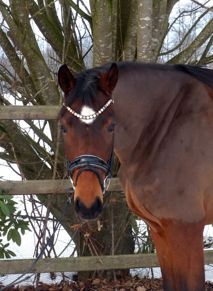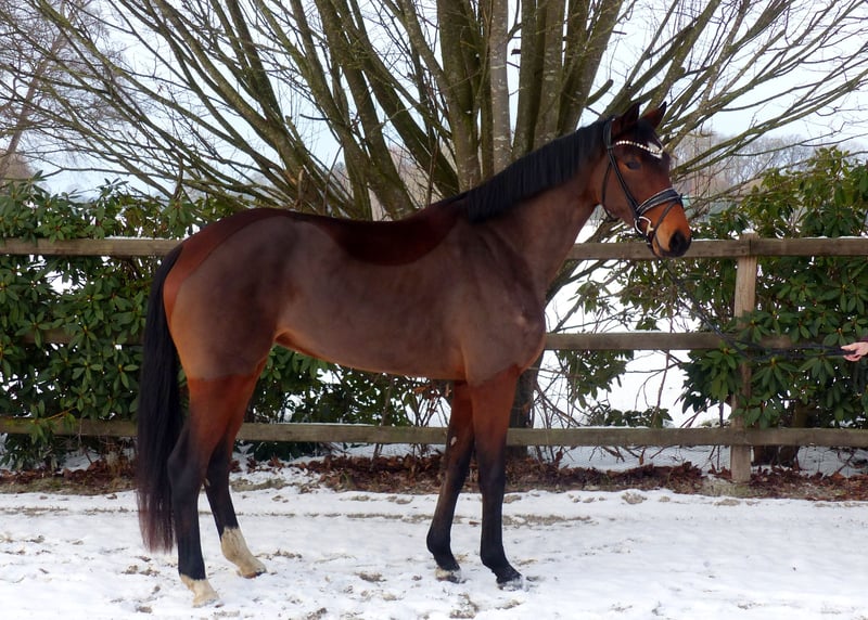 Wir bieten im Auftrag diese moderne, junge Stute an. Sie ist jetzt vier Jahre alt und stammt ab von Franklin x Florencio I . Sie ist etwa 1.67m groß und noch im Wachstum stehend. Sie zeigt drei sehr gute Grundgangarten wobei sie aktuell besonders mit ihrem Galopp und dem guten Schritt punkten kann. Leicht angeritten, macht sie schon ein gutes Bild unter dem Sattel. Körperlich braucht sie mit Sicherheit noch etwas Zeit, um ihre komplette Qualität unter dem Sattel zeigen zu können. Sie ist ein tolles Ausbildungspferd, was einfach noch etwas Zeit für ihre Entwicklung benötigt und daher jetzt zum Verkauf steht. Sie ist bei uns geboren und war immer gesund. Röntgenbilder wurden bisher noch nicht gemacht, können aber jederzeit gemacht werden. Preis ist VB.