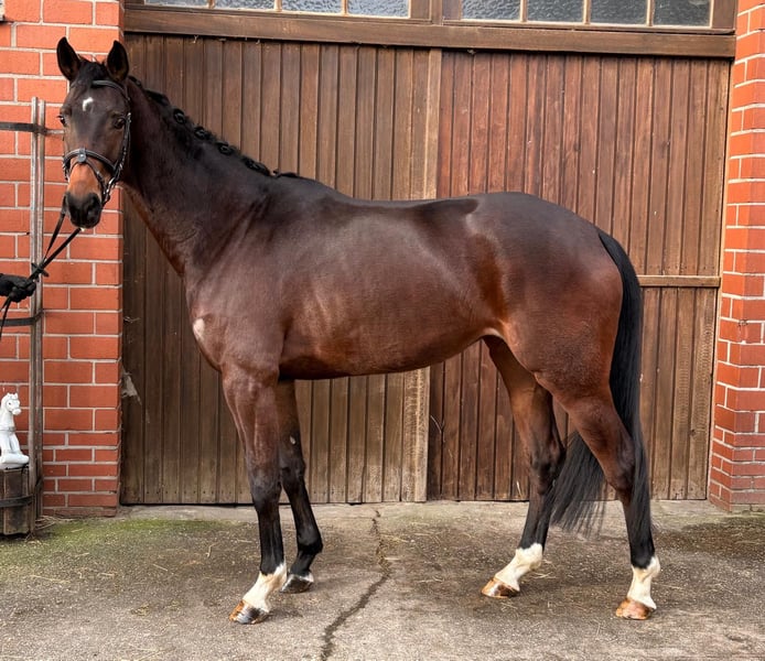 Direct from the breeder: Now a four-year-old mare by Bonjour out of a mare by Romanov - Farewell. The mare is approximately 1.68 m tall, very leggy, elegant, and noble, and is still fully in development physically. "Räuberin" has three above-average conformation points and, with proper and gentle training, will make an excellent dressage horse. She is a sensitive mare that needs trust and time, and therefore is not suitable for beginners. Her sister includes Ronja Räubertochter OLD, bronze medalist at the Bundeschampionate for three-year-olds in 2020 and Oldenburg Reserve Champion Mare on the Brillantring. The mare has a clean X-ray certificate and is in excellent health. She is currently in Ibbenbüren (North Rhine-Westphalia) for starting under saddle at a training stable.