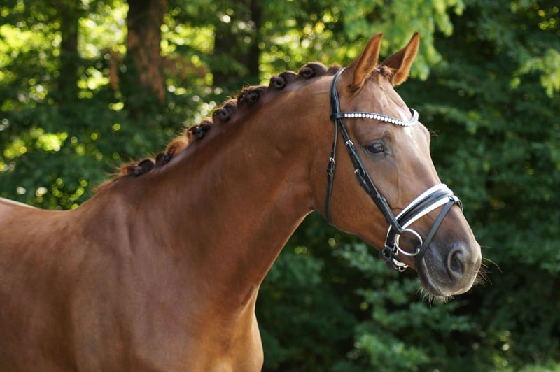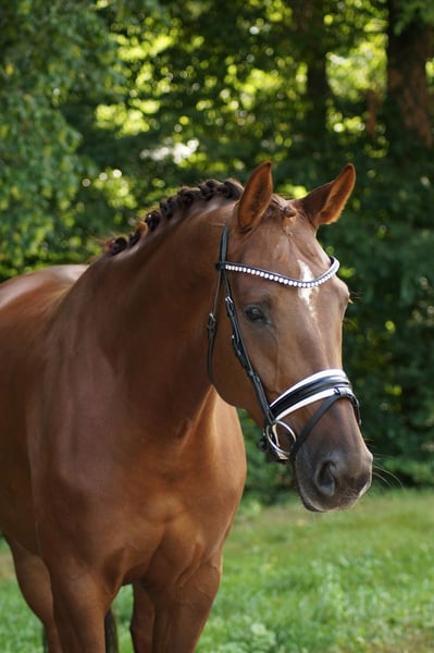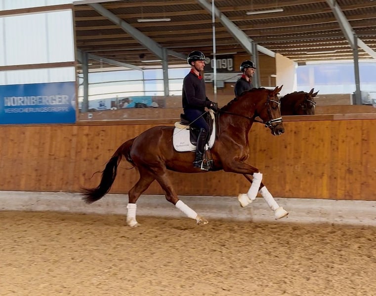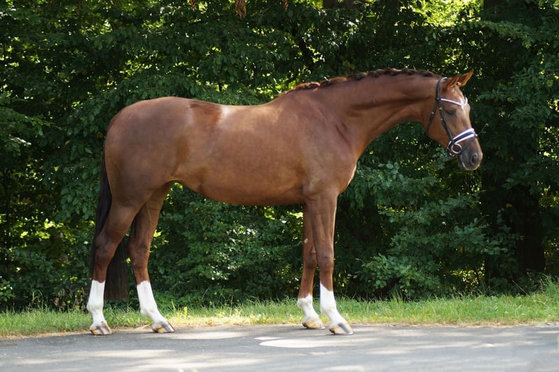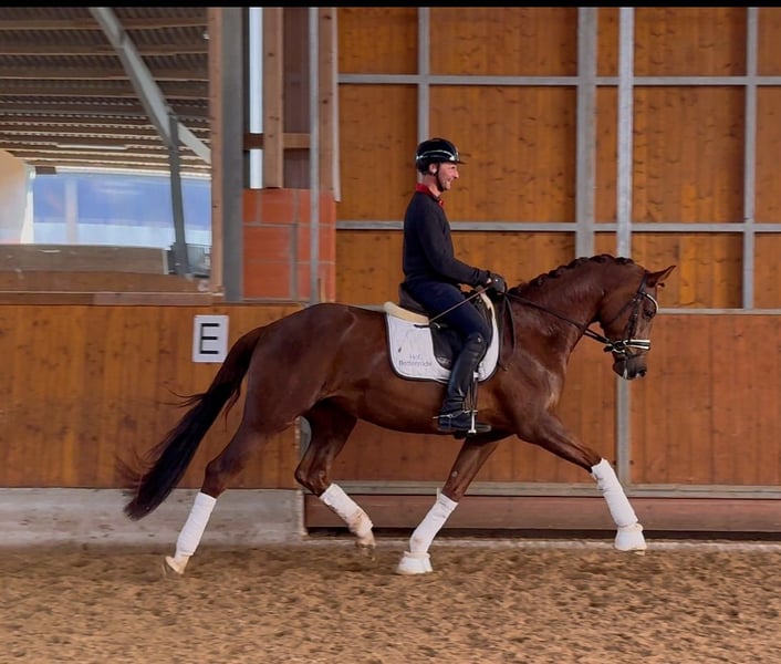 Pippa is a 4-year-old dark chestnut mare with a height of approximately 168cm - a true talent for movement with a great future in dressage. She is currently at riding horse level. Descending from Dynamic Dream, she shows a lot of push from the hindquarters, a canter that goes uphill, as well as impressive movement quality in all three basic gaits. She is developing further every day and is eager to learn from her rider. She captivates at first sight - with expression, elasticity, and potential for the big arena. A horse that leaves you in awe.