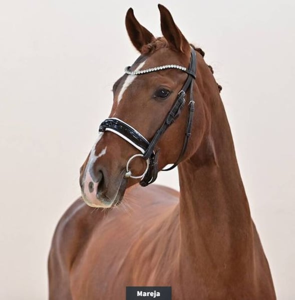 Mareja präsentiert sich hier im mittleren Rahmen stehend, sehr typvoll. Sie hat in 2024 noch ein Fohlen von Vitalis geführt. Bruder Daktylius OLD ist gekört und Prix St. Georges-siegreich/Eva Möller; Bruder Zam Pano ist Intermediaire II-erfolreich/ Yvonne Fiestelmann.