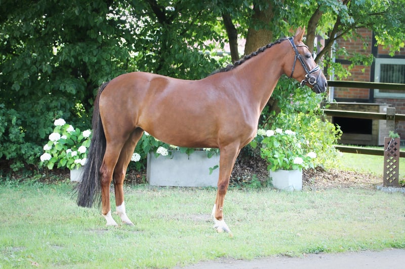 Beautiful Oldenburg Mare for Sale For sale is a pregnant Oldenburg mare, born in 2020. She presents herself in an elegant dark chestnut coat and has a height of 165 cm. This mare comes from a top-quality breeding and combines excellent bloodlines. Pregnant by By Your Side for 5/26. Her friendly and open nature makes her an ideal partner for all levels of experience. She is well-socialized and has a balanced character. Due to a pasture accident, she is not rideable. Genetically in top health. If you are interested or have further questions, please feel free to contact me. Visit us and see for yourself this wonderful mare!