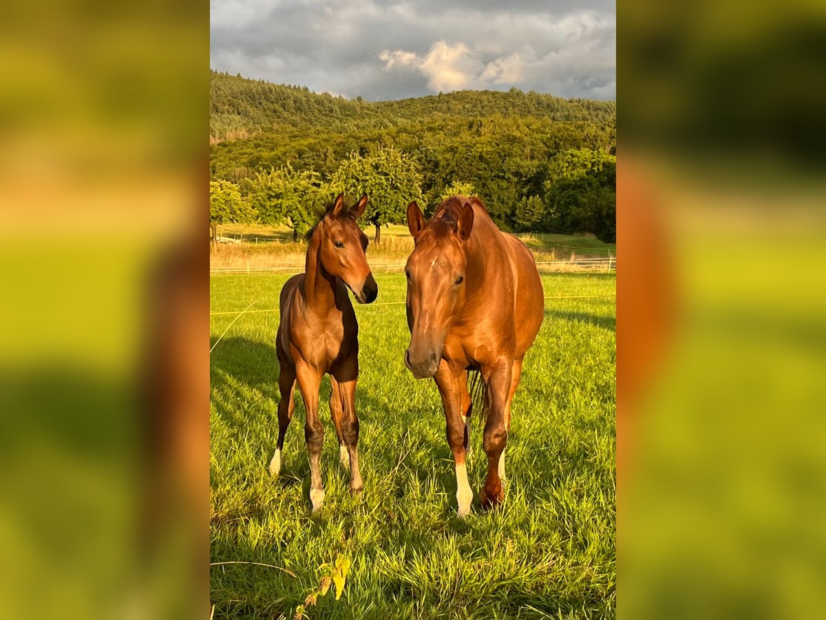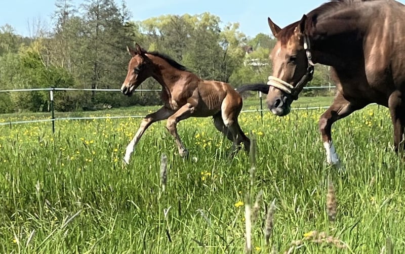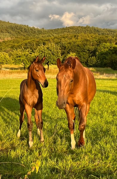 Wegen Bestandsreduzierung bieten wir hier unsere Mia zum Verkauf an. Die Stute ist bei uns in die Zucht gegangen, da sie als Fohlen eine Verletzung hatte. (Fesselbeinfissur) Sie hat zwei bildschöne, korrekte und bewegungsstarke Stutfohlen gebracht. (Können besichtigt werden) 2025 nicht gedeckt, könnte somit in einer der nächsten Rossen besamt werden. Bisher immer beim 1. Versuch tragend, problemlos abgefohlt, gute Mutterstute mit viel Milch. Mia wurde mit guten Noten ins Stutbuch/Hannoveraner aufgenommen. Sie ist Schmiede- und verladefromm, kennt Box sowie Weide/-Zelt. Eventuell auch als Beistellpferd, Bodenarbeit. Leider hat sie bei uns angefangen zu koppen. (Die beiden Jungstuten machen das nicht).