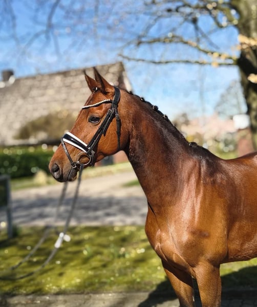 The perfect horse for the competition season. An absolutely charming mare, easy to handle and with a wonderful temperament. Very light in the bridle — making her an ideal horse for beginners or junior riders. Riding her is truly a pleasure. She is very well-behaved under saddle and also experienced in the outdoor arena. Additionally, she is calm and steady, suitable for riders of all levels. More information can be found on our website. Trial rides are available at any time by appointment.
