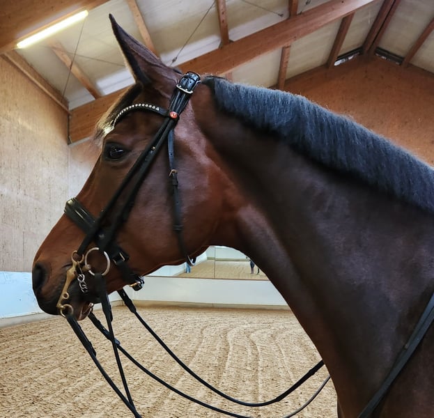 For sale is a beautiful mare born in 2017, sired by Millennium. Romy is a horse with presence, a very special charisma, and a wonderful temperament that leaves nothing to be desired. She has three above-average gaits, was placed at 8s in DPF A as a five-year-old, and is currently competing at M-level. She is also familiar with pole work, small jumps, and occasional hacks. Romy is always motivated, sensitive to ride, and brings a smile to her rider’s face every day. Unfortunately, she is afraid of oncoming horses when ridden. The warm-up area at competitions or a busy indoor arena in winter often cause her stress. Therefore, we are looking for a lovely home on a smaller riding facility and are offering her well below her actual value. She is an excellent school horse for someone who prefers to ride mostly at home and enjoy daily riding. In the paddock, other horses are no problem. She is very sociable and tends to be lower in the herd hierarchy. A quiet herd or a stable with outdoor turnout would also be possible. She is always uncomplicated in handling and loading. Further information and videos are available upon request via phone or WhatsApp at 0160-91648238.