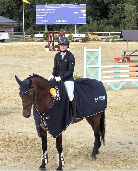 Lizzy is a versatile 9-year-old mare by Lordanos, known for her balanced temperament, making her suitable even for insecure riders and beginners with ambitions. She has only been ridden in young horse classes by experienced riders and has impressed with her consistent rhythm and fine contact, already winning show jumping classes at L level at the age of five. At six, she was able to place in an M* amateur class, and due to her reliable character, she helped a young girl transition from pony to horse, during which she achieved numerous wins and placings in E and A levels in dressage, show jumping, and trail riding. She has also gained experience in the Golden Bridle competition and at the youth training camp of the Niedersachsenmeute. A horse that always brings joy to daily work! Very uncomplicated when hacking out, traveling in the trailer, and with the farrier!