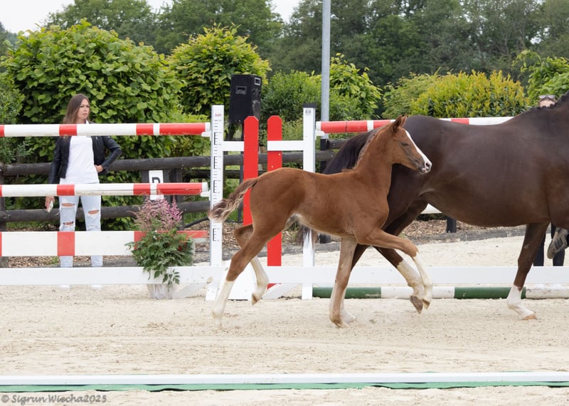 Vertrauensvoll und willig mitarbeitend war sie vom ersten Tag an. Mit natürlicher Präsenz punktet sie in allen Gangarten, insbesondere auch einem absolut überragenden Galopp. Zusammen mit ihrer Übersicht bringt sie also beste Vorausetzungen für die spätere Ausbildung mit. Das Pedigree ist sportlich geprägt. Veneno war Mannschafts-Gold Gewinner bei der WM der Junioren. In den wenigen Jahren seines Zuchteinsatzes brachte er u.a. die Hengste Valdiviani und Va Bene. Auf der mütterlichen Seite steht der schmale Vollblut-Leistungsstamm einer Tochter des Mansingh xx, Vater auch von Langata Express xx. Ihre Familie umfasst bisher einen gekörten Hengst, mehrere Prämienstuten und viele geliebte kopfklare Partner von Reiterinnen im Amateursport bis zur schweren Klasse. Ein Besuch im Gestüt Stöckerhof in Hennef ist nach Vereinbarung jederzeit möglich