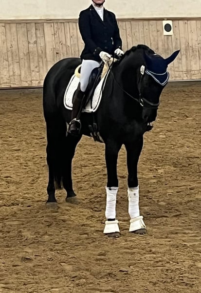 San Felice is a charming Oldenburg gelding with an excellent pedigree (San Amour – Rotspon). He impresses with a solid training up to the M level, where he has already been successfully presented. Trained in private hands with a lot of patience and feel, he has developed into a reliable partner who is always motivated to work and aims to please his rider. In daily handling, San Felice is exceptionally well-behaved, people-oriented, and uncomplicated. Whether grooming, farrier visits, loading, or out on the trails – he remains calm and dependable at all times. Under saddle, he stands out with his good rideability, natural balance, and fine responsiveness to aids. He works with focus, is comfortable to sit on, and provides a secure, harmonious riding experience. His rhythmical basic gaits and solid training make him an ideal partner for riders looking for a reliable and easy-to-ride horse at the M level. San Felice is healthy, regularly vaccinated, and is in loving private ownership. He is being sold due to my upcoming studies and only to the best hands, where his character and quality will be appreciated.