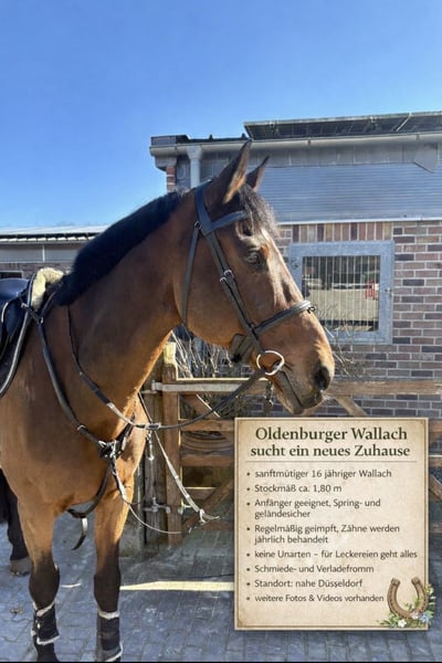Zum Verkauf steht dieser Oldenburger Wallach von 2010. Ein absolut braves und ausgeglichenes Pferd, das nach einem neuen Begleiter sucht. Schmiede-, Verlade-, Tierarztfromm und stets gesund. Ausreiten, longieren und sogar Voltigierübungen möglich. Auch als idealer Lehrpartner geeignet. Trotz der Größe ist er super leicht zu bedienen und achtet auf seinen Reiter. Videos können auf Anfrage gesendet werden.