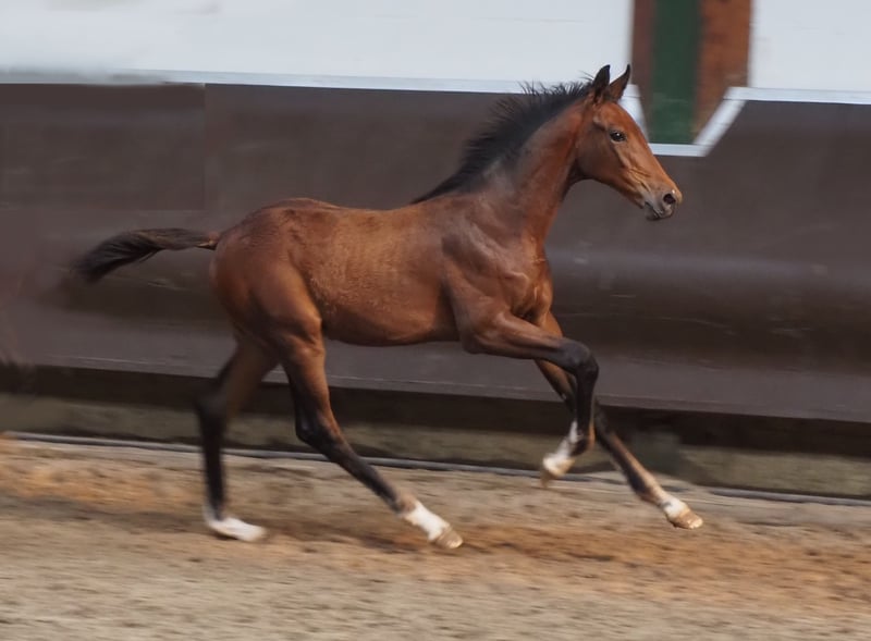 Grootramig jong paard met veel bewegingskwaliteit en enorme springaanleg! Met Cafe au lait als vader en Quattro B aan moederszijde (MMV) is hij dubbel verzekerd voor zowel dressuur als springen. Hij is vroeg geboren en al zeer goed ontwikkeld. Cafe au lait, winnaar van het verrichtingsonderzoek en BuCha finalist, heeft al een groot aantal internationaal succesvolle spring- en dressuurpaarden voortgebracht. Een van de weinige hengsten die kan bogen op een aantal succesvolle nakomelingen in beide disciplines tot op vergevorderd niveau! Cafe au lait was zelf Bundeschampionat finalist onder Philipp Weishaupt en is succesvol geweest tot en met gevorderd (S***) niveau in het springen, maar heeft ook drie spectaculaire gangen en is opgeleid tot en met gevorderd (S) niveau in de dressuur. Hij is gestationeerd bij Paul Schockemöhle en heeft al een aantal internationaal succesvolle springpaarden gebracht, waaronder "Royce", die zegevierde in de FEI CSI5* $500,000 Rolex Grand Prix Wellington. De gekeurde Cafe's Champus werd tweede op het wereldkampioenschap voor jonge paarden onder Rene Tebbel. Ook door ons gekeurd en gefokt: Cafe Junior (Cafe au lait x Silvio I), internationaal geplaatst in wedstrijden voor gevorderden (S*). Andere jonge paarden uit springgeoriënteerde fokmerries hebben zich al meerdere keren geplaatst in dressuurproeven voor jonge paarden van beginnend tot middelbaar niveau en zijn opvallend sterk bewegend en helder van geest. De "Cafe's" imponeren ook over de hele linie in de grote arena: Cafe's "Casimir" (Cafe au lait x Calido x Grannus) was de gevierde hoofdprijswinnaar op de Oldenburg Elite Auction, was op jonge leeftijd al seriewinnaar in dressuurproeven op medium (M) niveau en was als 7-jarige opnieuw seriewinnaar in zijn eerste dressuurproeven op gevorderd (S) niveau! Hij zegeviert nu in internationale Intermediaire I klassen. Kasselmann's merrie Cafe's Caletta (Cafe au lait x Calato) heeft ook al dressuurproeven voor gevorderden (S) en internationale Grand Prix gewonnen. Cafe's Matts (Cafe au lait x Don Frederico) was het op één na duurste dressuurpaard op de Oldenburger Summer Mixed Sales. Onze veulens krijgen dagelijks mineraalvoer en veulenstarter, regelmatig EQUISTRO Haemolytan en Ipaligo Foal, ontwormen en een hoefsmid zijn ook vanzelfsprekend. De moederdieren krijgen ook speciaal merrievoer tijdens de dracht, dagelijks sapvoer en lijnzaadolie, en hooi ad libitum. Dit zorgt ervoor dat onze nakomelingen altijd in optimale gezondheid verkeren! Meer veulens en nakomelingen uit ons eigen fokprogramma op aanvraag. Een kleine selectie is te vinden in de andere advertenties. We fokken ongeveer 20 cafe au lait veulens per jaar. Inruil van geschikte fokmerries mogelijk. Er zijn altijd wel enkele fokmerries drachtig te koop. Video aanvragen e.d. alleen vooraf mogelijk via WhatsApp. Een actueel zeer goed röntgenologisch certificaat is al beschikbaar.
