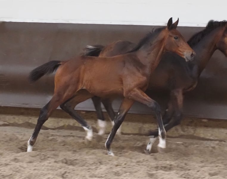 Noble, long-legged and typey 1.5-year-old stallion prospect with lots of movement quality! With Cafe au lait as his sire and Quattro B on the dam's side (MMV), he is doubly secured for dressage and show jumping alike. Licensed, HLP winner and BuCha finalist "Cafe au lait" has already produced a large number of internationally successful show jumping and dressage horses. One of the few sires who can boast a number of successful offspring in both disciplines up to advanced level! Cafe au lait himself was a Bundeschampionat finalist under Philipp Weishaupt and has been successful up to advanced (S***) level in show jumping, but also has three spectacular gaits and has been trained to advanced (S) level in dressage. Stationed with Paul Schockemöhle, he has already sired a number of internationally successful show jumpers, including "Royce", victorious in the FEI CSI5* $500,000 Rolex Grand Prix Wellington. The licensed Cafe's Champus was Vice World Champion of the young horses under Rene Tebbel. Also licensed and bred by us: Cafe Junior (Cafe au lait x Silvio I), placed internationally in advanced (S*) level show jumping competitions. Other young horses out of jumping-oriented dams have already placed several times in tests for young dressage horses from novice to medium level and are remarkably strong-moving and clear-headed. The "Cafe's" also impress across the board in the big arena: Cafe's "Casimir" (Cafe au lait x Calido x Grannus) was the celebrated top prize winner at the Oldenburg Elite Auction, was a series winner in medium (M) level dressage horses at a young age, and was a series winner again in his first advanced (S) level dressage tests as a 7-year-old! He is now victorious in international Intermediaire I classes. Kasselmann's mare Cafe's Caletta (Cafe au lait x Calato) has also already won advanced (S) level dressage and international Grand Prix. Cafe's Matts (Cafe au lait x Don Frederico) was the second most expensive dressage horse at the Oldenburg Summer Mixed Sales. Our foals receive daily mineral feed and foal starter, regular EQUISTRO Haemolytan and Ipaligo Foal, worming and a farrier are also a matter of course. The dams also receive special mare feed throughout their pregnancy, daily juice feed and linseed oil, as well as hay ad libitum. This ensures that our offspring are always in the best of health! Further foals and offspring from our own breeding on request. A small selection can be found under the other advertisements. We produce around 20 cafe au lait foals every year. Trade-in of suitable broodmares possible. There are always a few broodmares in foal for sale. Video inquiries only possible via WhatsApp.