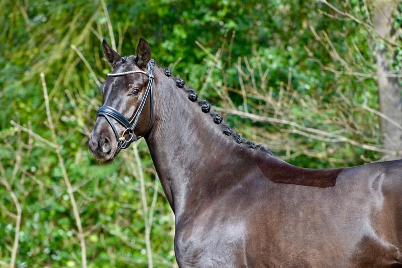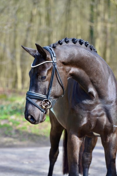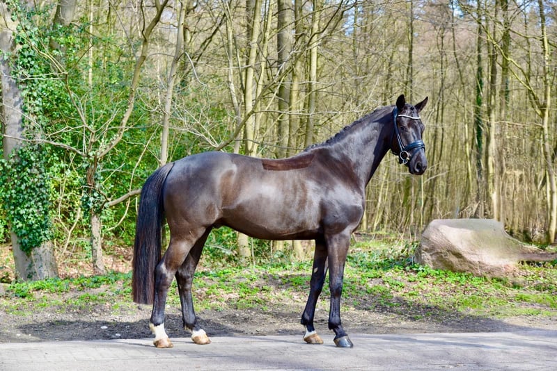 "Dimpel" is a medium-sized (16.1 hh), four-year-old gelding from our breeding program. He has three evenly matched, very good basic gaits, plenty of hindquarter activity, and, despite his youth, already demonstrates excellent rideability and balance. Equipped with a lot of natural impulsion, he consistently appears focused and motivated. He has been under saddle for nearly six months, has not yet been shown publicly, but is on a solid training path, so he could confidently make his first competitive appearances in Dressage Horse A level later this year. Very friendly and human-oriented, he is comfortable on small hacks in the terrain as well as working over poles and cavaletti. He is farrier- and loading-friendly and always displays a trusting attitude with a positive outlook towards new experiences. With further training, this promising young horse will develop into an excellent competition prospect.