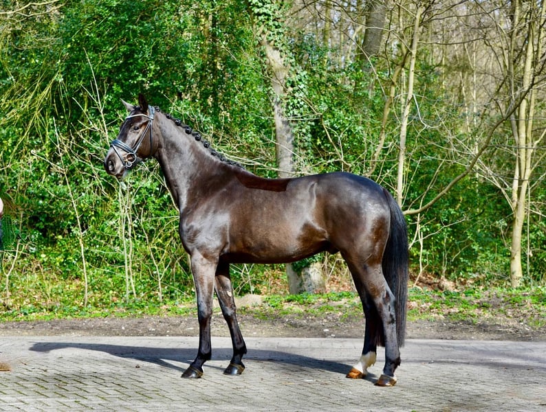 "Dimpel" ist ein mittelgroßer (1,66 m), vierjähriger Wallach aus unserer Zucht mit drei gleichmäßig sehr guten Grundgangarten, viel Hinterhandsmotorik und trotz seiner Jugend schon sehr guter Rittigkeit und Balance. Mit viel Grundschwung ausgestattet zeigt er sich immer konzentriert und motiviert. Er ist seit knapp sechs Monaten in Arbeit unter dem Sattel, noch nicht öffentlich gezeigt, aber auf einem ausbildungsmäßig gutem Weg, so dass er sicher seine ersten sportlichen Einsätze auf Dressurpferde A Niveau in diesem Jahr absolvieren könnte. Sehr freundlich und dem Menschen zugewandt kennt er kleine Ausritte ins Gelände genauso wie Arbeit über Stangen und Cavalettis. Er ist schmiede- und verladefromm und zeigt sich stets vertrauensvoll mit einer positiven Grundeinstellung allem Neuen gegenüber. Bei weitere Ausbildung reift hier ein tolles Nachwuchspferd heran.