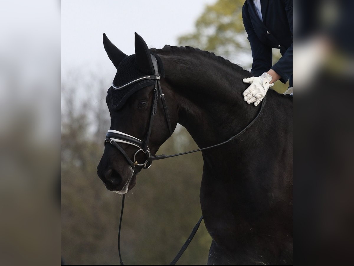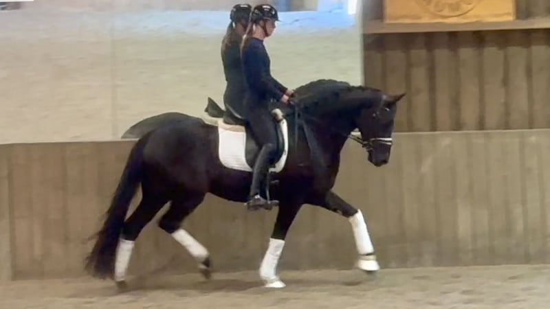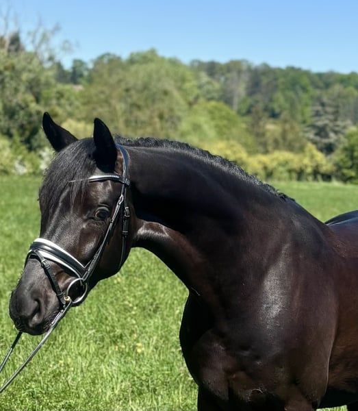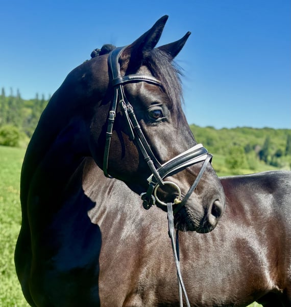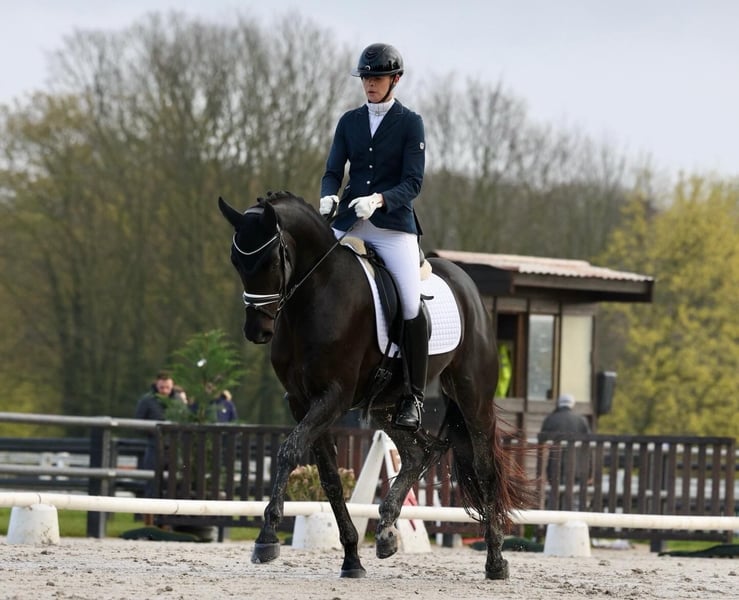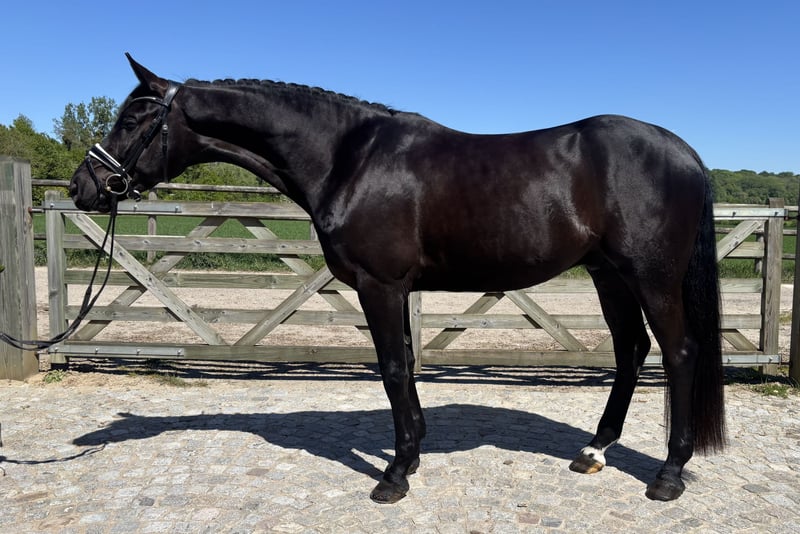 Safe, talented, and incredibly rideable—Bohemi Black is the kind of 4-year-old everyone is looking for. Extremely level-headed and consistent—he comes out exactly the same every day with no need for lunging or preparation. Easy to take straight to work or out hacking. Very reliable in all environments. Super amateur-friendly. Naturally forward-thinking without being hot, with the ideal balance of whoa and go. Light in the contact, responsive off the leg, and able to hold a rhythm effortlessly. Very comfortable to sit with an elastic trot, balanced canter, and correct four-beat walk. Shows very good natural balance and learns quickly. Schooling leg yields, counter canter, and beginning simple changes—all straightforward and easy to ride. Scored 76% at his first show and behaved impeccably. VERY SAFE. No spook, buck, bolt, rear, etc. Sensible, forgiving, and easy to ride every day. Suitable for an amateur to produce, yet quality enough for a professional. Excellent ground manners. Kind, affectionate, and very people-oriented— a true “people pleaser” in the stable. Very eye-catching horse with a strong presence—consistently turns heads. Good to hack alone or in company. Clean X-rays on file. Up to date on teeth, vaccinations, and deworming. Rider in video is 180 cm. Bohemi Black would suit a wide range of riders—from an amateur looking for a safe, talented young horse to develop, to a professional seeking a straightforward and quality prospect. Bohemi Black is located 30 minutes west of Paris, 50 minutes from CDG and 40 minutes from Orly Airport Please contact Talia (+33 7 49 23 99 78) for more info
