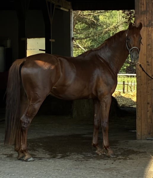 Strikingly beautiful and bright red chestnut gelding for sale, Georgino is an incredibly charming, friendly and playful chestnut gelding with really incredible basic gaits that are full of elegance and suppleness. He is easily broken in and is ready to learn and very well-behaved for his new challenges! A dream guard who is looking for his confidant for fun in dressage, small show jumping and leisure sport. He is incredibly playful, loving and affectionate. You are welcome to get to know Georgino and make an appointment by calling 0160-7247515.