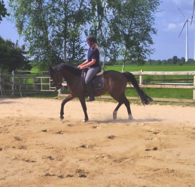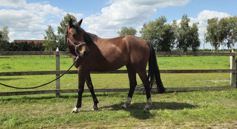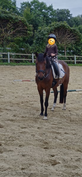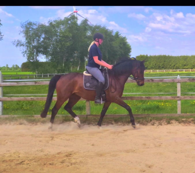 For sale is this beautiful 5-year-old gelding by Estobar NRW × Rubino Rosso × Pik Bube II. Easy has been under saddle for about 1 year. He impresses everyone with his super calm, relaxed character and great work ethic. This makes him a fantastic horse for transitioning riders. He has a height of approximately 164 cm. I myself am 183 cm tall, and as you can see, he covers the height well. He is familiar with unfamiliar riding arenas, short trail rides, light pole work, as well as loading and the farrier. If interested or for further questions, please feel free to contact me.