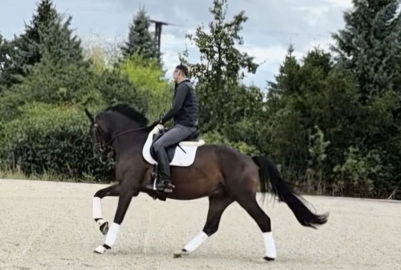 For sale is Bonegro, a beautiful Oldenburg gelding born in 2021. With his elegant dark brown coat and a height of 16.1 hh, he is a real eye-catcher. This talented gelding shows great potential in dressage and is ready to be further developed. He impresses not only with his relaxed basic gaits but is also very well-behaved, easy to ride, and has a high willingness to learn. He has already placed in dressage horse tests at the A level after a short time and is uncomplicated at competitions. He is suitable for both leisure and competition riding. From the direct maternal line, numerous horses have been successful in dressage at the M and S levels with amateur riders. If you are interested or need further information, please feel free to contact me. Video available via WhatsApp. Don't miss this opportunity to find a promising and reliable partner for the future!