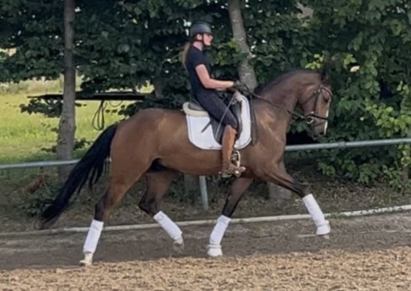 For Sale: Oldenburg Gelding – Perfect for Dressage! We are offering a stylish dark bay Oldenburg gelding, born in 2021. Standing at 17.2 hh, he impresses with his impressive size and elegant appearance. The gelding also demonstrates great talent and a strong willingness to learn. He is healthy, well-trained, and has a pleasant temperament. Friendly in handling and easy to ride, he makes a promising partner for ambitious riders. He has been successful in young horse classes as well as in A-level dressage competitions. With further training next year, he will be ready to compete in L-level dressage. Due to occasional napping, he is being sold at a significantly reduced price. Please feel free to contact me for more information or if you have any questions.
