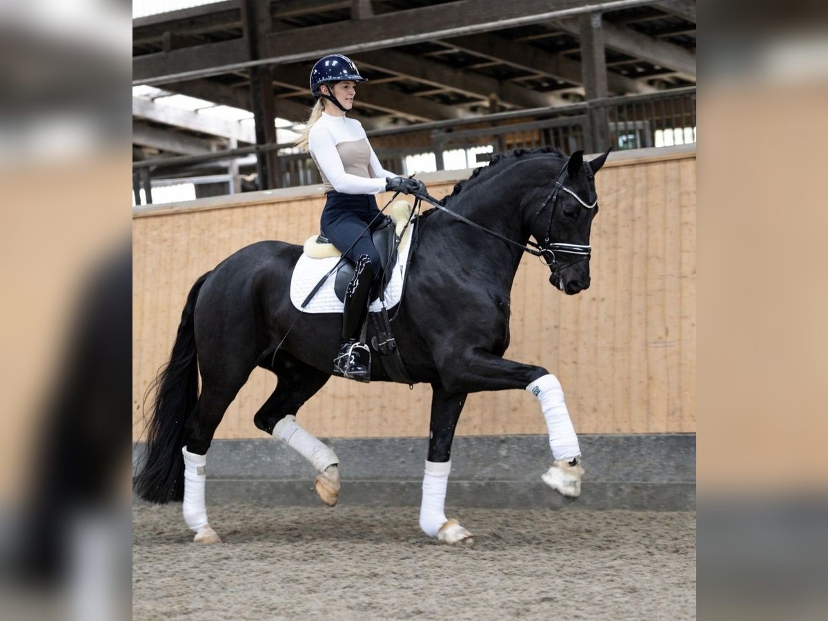 For sale is the charismatic and impressive gelding Riovaldi. He was presented at the Oldenburg licensing in Vechta in early 2024 and received a positive licensing verdict. Subsequently, he was castrated at the age of three and has since enjoyed a wonderful life as a riding horse. Riovaldi impresses with three outstanding basic gaits, a stunning appearance in his dark coat, and plenty of quality under the saddle. He is currently being gently introduced to L-level dressage movements, such as extended trot, canter-trot transitions, walk-canter transitions, and flying changes, all of which he performs confidently. In addition, he shows remarkable talent for piaffe and passage, bringing great joy to his rider every day. In handling, he is uncomplicated, friendly, and steady-nerved, both in daily interactions and within the herd. He also comes from a highly interesting dam line: His mother, Venecia OLD, was Vice Federal Champion and has competed successfully up to Inter I. Please no email inquiries, only contact by phone. Information provided without guarantee. Price plus VAT.