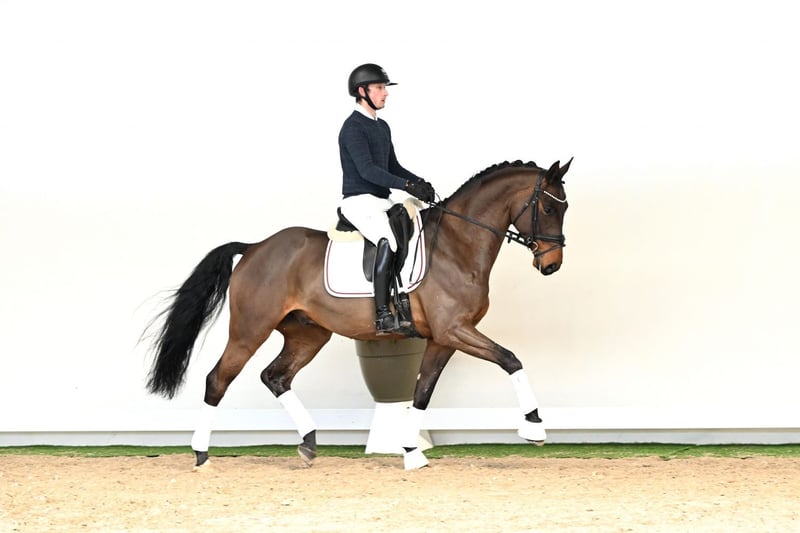 This 6-year-old gelding presents himself as a likeable and honest young prospect who has not yet been shown in public. With his well-proportioned size, an attractive outline, and natural elegance, he makes a very harmonious overall impression. In trot, he is expressive, rhythmical, and moves consistently through his body – comfortable to sit and always easy to regulate. Overall, he is a horse that demonstrates clear, correct, and appealing movement. Particularly noteworthy is his rideability: well-behaved, uncomplicated, and attentive to the rider’s aids. He gives a secure feeling under saddle and impresses with his cooperative attitude in daily work. A horse that is simply a pleasure to ride and presents himself as a reliable partner. His pedigree is equally appealing: his sire, Fynch Hatton, stands for modern dressage quality and excellent rideability. On the dam’s side, Top Gear OLD – especially renowned for his outstanding character and rideability – further reinforces these traits. Combined with Hotline and Sandro Hit, he offers proven and solid dressage genetics. An ideal horse for riders seeking an uncomplicated, rideable, and genuine partner for both everyday enjoyment and success in dressage sport.