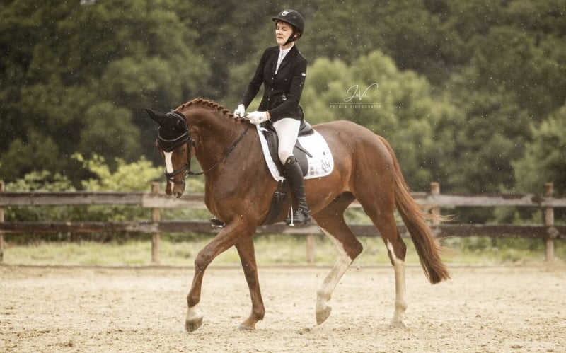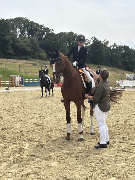 For sale is the 7-year-old chestnut gelding “Beau L’amour” (born 2018). Standing at 16.1 hh, this Oldenburg is an absolute dream horse both in handling and under saddle. With three very good basic gaits, the talented gelding impresses with his expressive, ground-covering movements. His calm and composed demeanor, combined with a pleasant work attitude, makes “Beau L’amour” a reliable partner in daily training. He has already been introduced to dressage competitions at the A-level, where he has achieved several placings and wins. He consistently performs impeccably, even in unfamiliar environments. Just a few days ago, he was ridden a few rounds by a beginner rider, and once again, he proved to be absolutely gentle and uncomplicated. He is also an absolute treasure alone in the field. Ideal for riders looking for a talented, rideable horse with a balanced character. Please feel free to contact me for further information or if you are interested!
