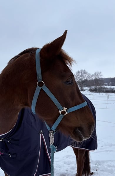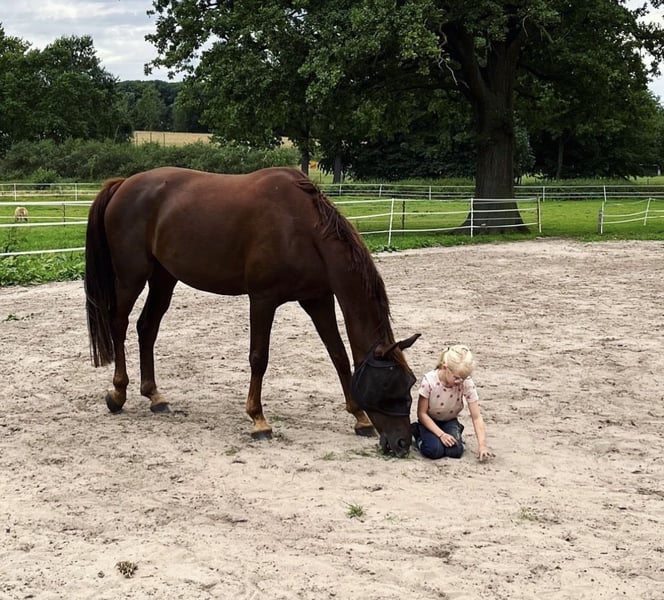 With a heavy heart, I am seeking a new, loving home for my Oldenburg gelding (born 2017). He is a very special horse – incredibly gentle, very human-oriented, and simply a horse that brings a smile to your face every day. He enjoys close contact with people and consistently shows himself to be friendly, calm, and honest in everyday handling. He is also well-behaved and reliable around children. He has been backed and has always worked willingly during riding sessions. Unfortunately, he exhibits some irregularities in his gait when ridden, the cause of which has not yet been definitively determined. However, with patience, time, and continued muscle development, this can improve. Due to bad weather and the lack of an indoor riding arena, he has been on pasture for about half a year and is currently not in training. But if you gradually reintroduce riding and give him the necessary time, he quickly shows what a super loving and dependable horse he is. In daily handling, he is truly uncomplicated: • Absolutely well-behaved at the farrier • Loading is still a bit difficult for him – he needs calm, patient people who can give him security My heartfelt wish is for him to find a quiet home with understanding and patient people who won’t try to "make him fit" but accept him as he is. He has so much love to give and deserves to find his place. I see him as: • a loyal leisure partner • or a loving companion Price: €1,900 Viewing possible by appointment