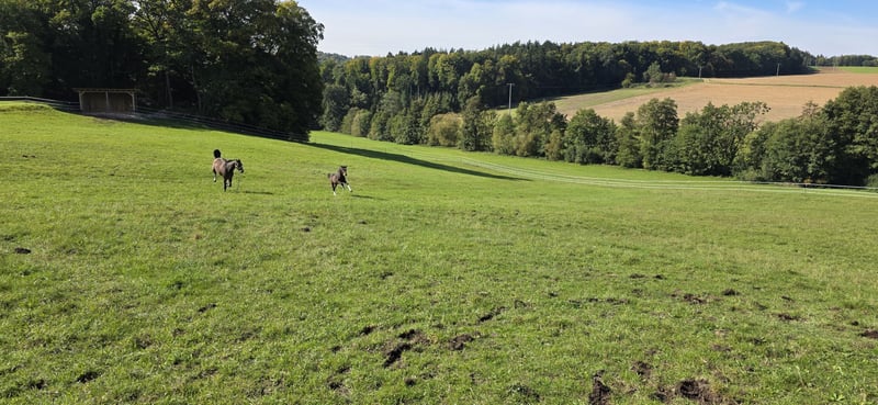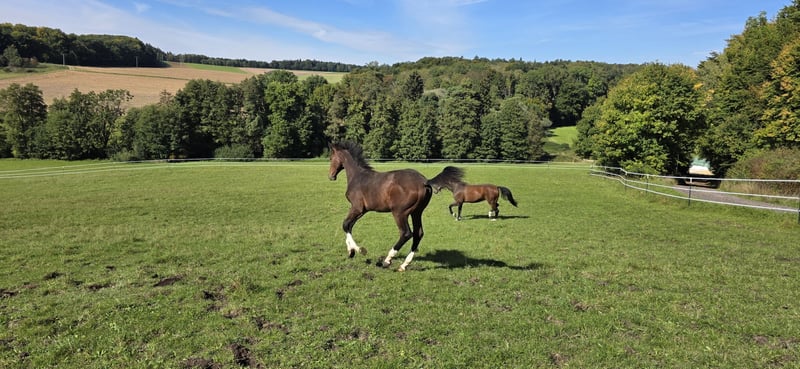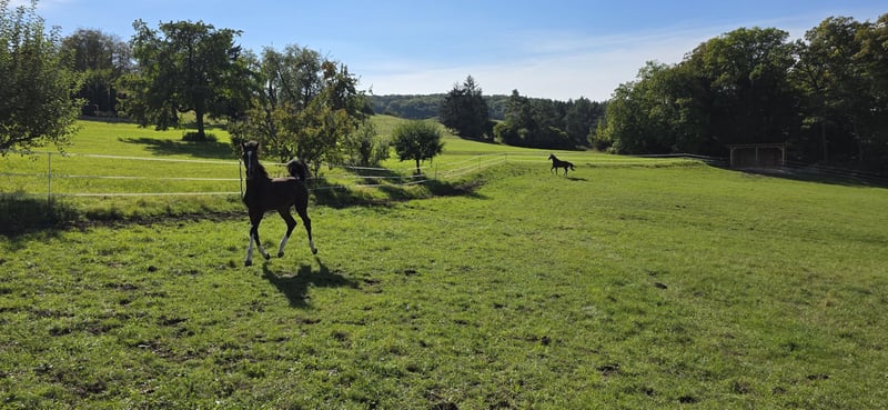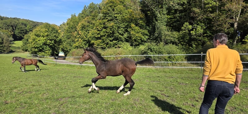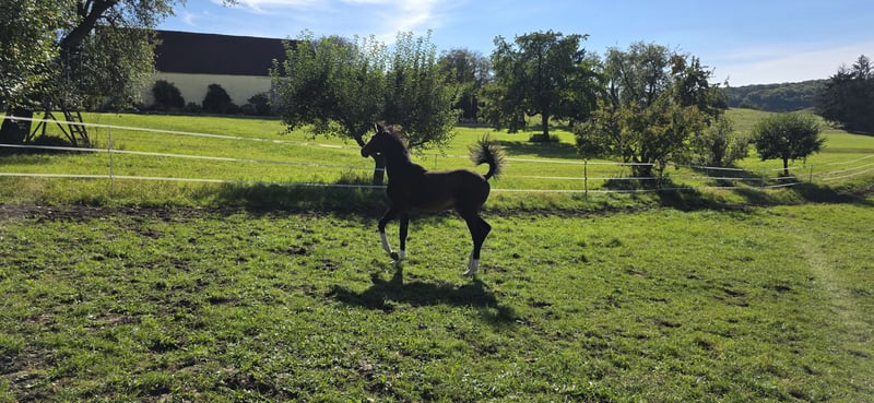 Ausdrucksstarkes Hengstfohlen von Chardonnay aus einer großrahmigen Stute ( 1,76 m ), S** mehrfach platziert. Das Fohlen hat einen ausgesprochenen guten Charakter, ist sehr Menschen bezogen und neugierig. Er wurde regelmäßig entwurmt, war beim Hufschmied und kennt das Fohlen ABC. Eine Besichtigung ist nach Absprache möglich.