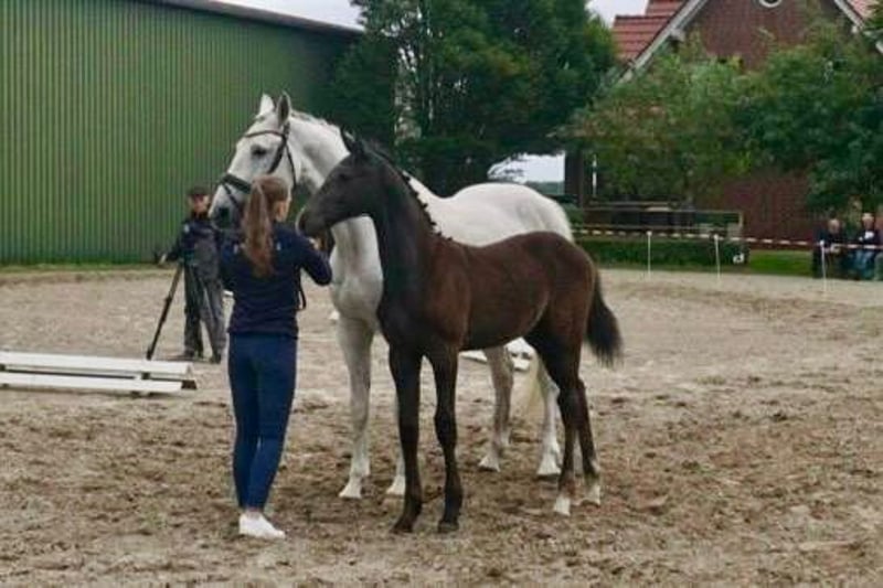 On February 21, this athletic charmer by Cornet Obolensky came into the world. His mother, the elite and state premium mare Belle Vue by Calido I-Lord Liberty-Inshallah AA-Furioso II, has already given life to two licensed stallions who have won in the advanced class. One of these sons also won bronze at the Bundeschampionat in Warendorf. Belle Vue was celebrated as the winner of her mare performance test in Vechta at the age of four and comes from the highly successful lineage of Bellavista, the silverware of Oldenburg breeding. Cosimo Royal impresses daily with his impeccable character and has mastered the foal ABC. Additionally, he was awarded during the foal registration.