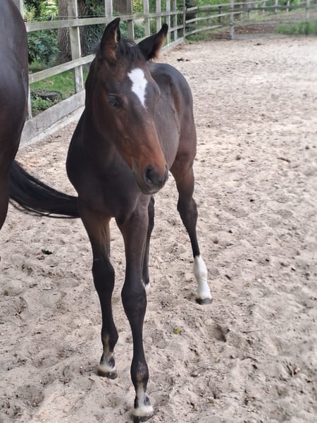 Jabaluna, this modern and typy filly combines international top bloodlines with proven sport performance on the maternal side. Sire: Jasper (Heartbreaker x Darco x Ramiro Z) Jasper himself was successful internationally up to 1.60 m and participated in the Global Champions Tour, among others. With heart, caution, and ability, he influenced both his sport performances and his offspring. His pedigree is a sporting accolade: Heartbreaker – one of the most influential stallions worldwide in breeding and sport. Darco – Olympic horse and line founder, known for strength and attitude. Ramiro Z – one of the most significant breeding legends in warmblood breeding. Dam: Cadenta (Cantolar x Cardento x Zeus) The dam Cadenta was able to impress in sport herself before a pasture accident ended her career prematurely: Victories up to A-level show jumping (A**), Placings in L-level show jumping, very promising for the higher classes. Through Cardento and Zeus, the maternal line is additionally well secured. Exterior & Movement Modern, blood-typed sport model with correct foundation. Expressive, with a harmonious top line. Strong movement, especially with an elastic, uphill-carrying canter. Character People-oriented and friendly, curious in daily handling. Perspective A foal with all the qualities for international show jumping – and at the same time interesting for breeding, thanks to the double security provided by a successful dam and a top pedigree on the sire's side.