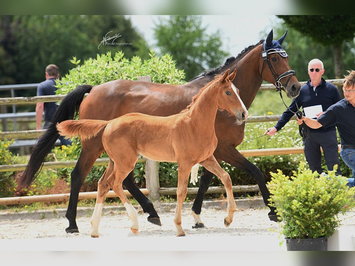 For sale is a promising Oldenburg mare, born on March 24, 2025. This elegant chestnut mare impresses with her excellent conformation and appealing presence. She is ideally suited for show jumping and stands out due to her brave character and high learning ability. With a solid basic education and great potential for the future, she is the perfect partner for ambitious riders. She is well-handled, well-behaved in the stable, and has a friendly, balanced temperament. If you are interested or would like more information, please feel free to contact me. Visit us and see for yourself this exceptional mare!