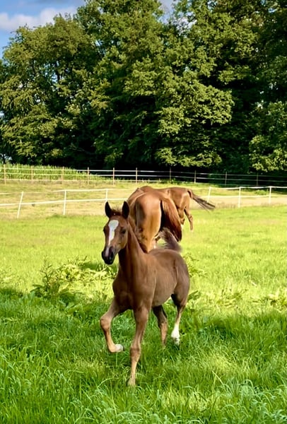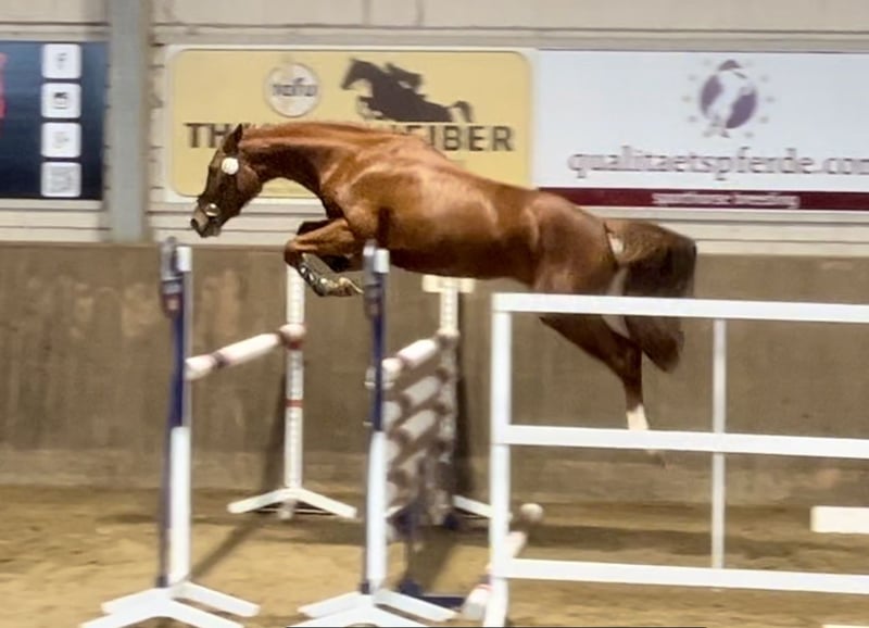 Zum Verkauf steht eine talentierte Oldenburger Stute, geboren im Jahr 2021. Diese wunderschöne Fuchsstute und überzeugt durch ihre unerschrockene Art und ihr freundliches Wesen. Auch später als super Umsteiger-/ Childrenpferd. Die Stute zeigt bereits vielversprechende Fähigkeiten bei den ersten Sprüngen und hat das Potenzial, in der Zukunft in den höheren Klassen erfolgreich zu sein. Ihr freundliches und aufgeschlossenes Wesen macht sie zu einer idealen Partnerin für Reiter, die sowohl im Training als auch auf dem Turnier eine zuverlässige Begleiterin suchen. Mutter war selbst mit Amateure bis M-Springen erfolgreich. Sie ist gut erzogen, regelmäßig geimpft und entwurmt. Bei Interesse oder weiteren Fragen stehe ich Ihnen gerne zur Verfügung.