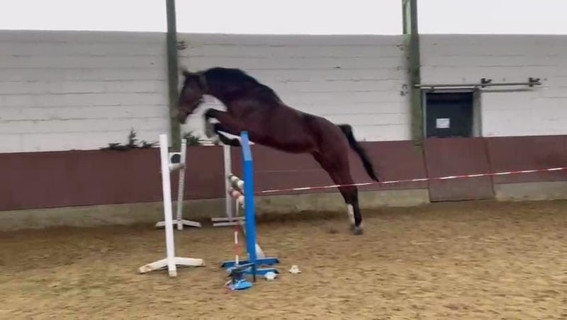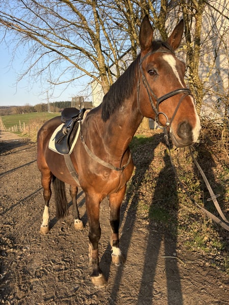 Wenn der Name Programm ist: „Buddy“ sucht ein 5*-Zuhause! Dieser 9-jährige Oldenburger Wallach (v. Niagara d’Elle x Carambole) ist ein echter Kumpel-Typ, der für jeden Spaß zu haben ist. Aufgrund der Selbstständigkeit und dem daraus resultierenden Zeitmangel des Besitzers (ehemaliger Bereiter) sucht dieser charmante Riese nun einen neuen Wirkungskreis. Sport & Gelände: Turnierfertig auf L-Niveau vorgestellt und platziert. Zu Hause zeigt er sich beim Springen souverän auf M-Niveau mit viel Vermögen und Übersicht. Absolut geländesicher (alleine und in der Gruppe). Trotz seiner stattlichen Größe von ca. 1,80 m ist er sehr wendig und leicht-rittig, bietet einem die Anlehnung an und trägt sich selbst. Sporen und Gerte sind nicht von Nöten, da er nicht triebig sondern gehfreudig ist. Charakter & Haltung: Buddy ist ein unkomplizierter Partner. Er ist schmiede- und verladefromm und kennt sowohl Herdenhaltung als auch Einzelweide. Er hat einen tollen Zug zum Sprung, bleibt dabei aber immer regulierbar und wird nicht „heiß“. Wichtiger Hinweis: Er zeigt im Schritt einen Hahnentritt, wenn er zB gerade aus der Box kommt. In den anderen Gangarten ist dies nicht wahrnehmbar, seine Leistungsfähigkeit und Lebensfreude werden nicht beeinträchtigt. 3-jährig wurde ein TÜV gemacht, die Unterlagen sind vorhanden. Wir suchen für ihn eine feste Bezugsperson, die seine Qualität zu schätzen weiß. Eckdaten: *2016 / Oldenburger Stockmaß um 1,80 m Keine Händleranfragen! Videos können nach Erstkontakt auf Anfrage geschickt werden.