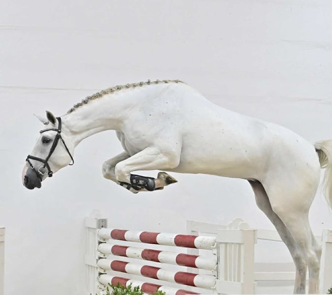 For sale: a beautiful Oldenburg show jumping gelding, born in 2021. The gelding is gray and stands an impressive 16.9 hh. An excellent jumper with great potential for the future. Perfect for a rider seeking an ambitious and versatile partner. Please contact us for more information!