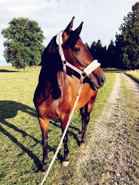 Wunderschöne schwarzebraune Stute sucht Endplatz bei ambitioniert Freizeitreiter Schweren Herzens muss ich meine Feliz, eine österreichische Warmblutstute abgeben. Durch die Geburt unseres zweiten Sohnes werde ich ihr leider nicht mehr gerecht. Feliz ist eine bildhübsche schwarzbraune 15 jährige 1,61 m große Stute, welche erst in zweiter Hand bei mir ist. Sie ist eine gute und verlässliche Springerin, geht gerne ins Gelände und ist durch ihre schwungvolle Bewegung in der dressurmäßigen Arbeit sehr sitzbequem. Jedoch benötigt sie einen starken Reiter, da sie zu Beginn gerne testet. Wenn sie jedoch Vertauen gefunden hat geht sie für ihren Reiter durch dick und dünn. Feli hat an der Hinderhand einen Befund der durch regelmäßige Physiotherapie behandelt wird. Näheres gerne telefonisch. Aktuell steht sie in einem Offenstall was ich mir für sie gerne weiterhin wünschen würde. Sie ist entwurmt, zweifach beschlagen und die Zähne werden regelmäßig kontrolliert. Ich suche für meine Feli einen tollen Endplatz an dem sie genauso wertgeschätzt wird wie bei uns. Es zählt Platz vor Preis. Kein Notverkauf! Um Pferdetourismus vorzubeugen und meine Feli zu schützen berechne ich eine Gebühr von 20€ beim Probereiten die beim Kauf natürlich erstattet wird. Zudem hätte ich gerne ein Video, um mich von deinem reiterlichen Können vorab zu überzeugen. Weitere Informationen. Bilder und Videos gibt es nur bei der angegebenen Telefonnummer +49 170 8013738