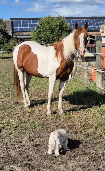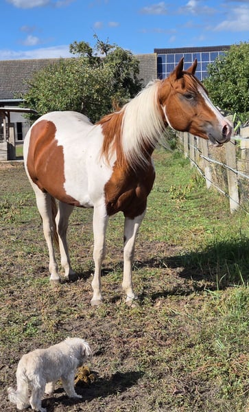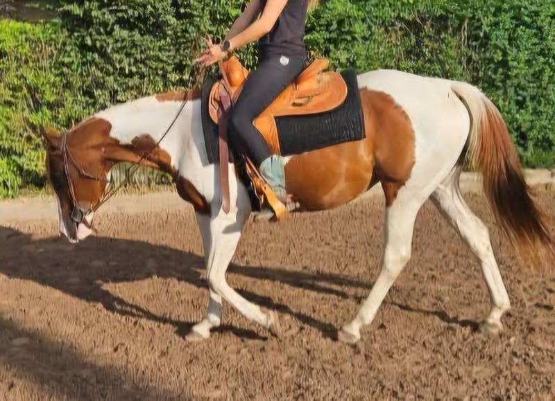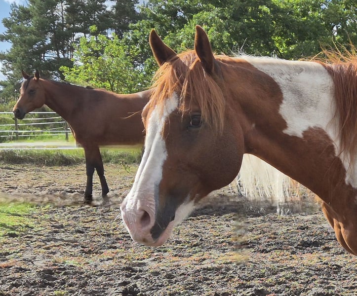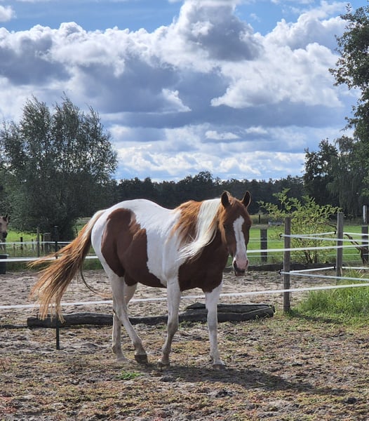 American Paint Horse mare, born 6/2011, Sorrel-Tobiano, approximately 153 cm, 5 Panel N/N, veterinary check from 8/2025 available, with APHA papers. Pedigree: Sire: MHAFreckle Tari Dam: Peponita Chex Star Due to health reasons, I unfortunately have to part with my beautiful mare "Sweet Freckles Pepi." She received a solid basic training as a young horse and has since been ridden almost exclusively in the countryside. She shows herself to be very well-behaved and fearless. In the arena, she is diligent and enjoys working. She has smooth gaits and is very comfortable to ride. In the herd, she is absolutely compatible and low-ranking. She is also very well-behaved and uncomplicated in daily handling.