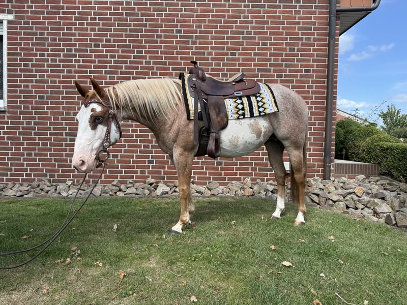 Smart Shining Jetta, aka Smarty, is an 11-year-old Paint gelding. Due to time constraints, he is now available for sale. Smarty consistently shows motivation and willingness to work, so we are looking for a new home where he will be more actively engaged. He is kept with us in a pasture turnout but is also familiar with being turned out in the mornings and stabled in the evenings. He will not be sold into a more or less fully box-stabled environment. Smarty has a versatile pedigree and is familiar with reining maneuvers (except flying changes). He competed in EWU events as a 4- and 5-year-old in class 1, earning several placings and winning a bronze EWU Horse Medal in Ranch Riding. In recent years, he has participated in smaller EWU competitions, where he also achieved placing ribbons. Smarty always wants to please, and occasionally shows more go, but remains gentle and friendly. Therefore, he may not be ideal for absolute beginners, but he can also be ridden by children. Smarty is suitable for any fun activity—whether riding alone or in a group of 30 horses. He loads easily and is a loyal companion in all areas. At two years old, he suffered from a periodic eye inflammation, which was surgically treated. He has some visual impairments in his left eye, but these do not affect his handling or riding in any way. Because of this, he is offered below his value. If interested, I can gladly send a video. To help prevent rearing or spooking during riding, we charge €30 for a trial ride, which will be deducted from the purchase price if you decide to buy.