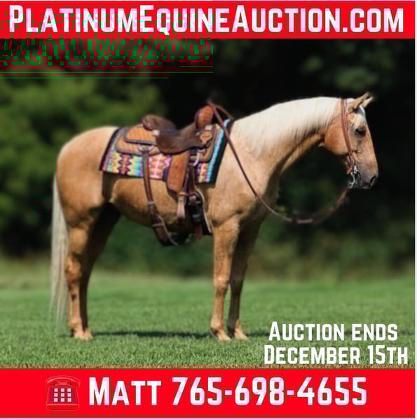 ONLINE AUCTION Place your bids at www.PlatinumEquineAuction.com Starting Bid $3500 Auction ends December 15th, 2024 Need a new saddle? Check out White Rock Saddles on our website or Facebook! A Zans Olen Jack is a stout built Golden Palomino Gelding. He is standing 15.1hh and he is a 2017 Model Registered AQHA Gelding. He is well bred going back to Zan Parr Bar and is a rare find with Two Eyed Jack still listed on his pedigree. Zan is a do it all kind of horse! He can go out and hit the trails and just cruise along slow and easy. He rides with his head low and will keep a loose/draped rein. He has been exposed to all kinds of wildlife. He will go up or down steep slopes, across deep creeks, over downed trees, and over all types of rough terrain while still being sure footed. He has been ridden through town and is safe in traffic is not spooky. He has been started on the roping dummy and is doing a good job tracking it. He knows his way around the ranch and has plenty of cow sense. We have taken him on several cow catching jobs and roped cows and big bulls on him. He will work the rope while you tie one down and knows how to help you get the job done. He has a smooth jog, a VERY VERY nice easy to set lope, a good stop, turns a circle both ways and backs with ease! Zan is an excellent horse for anything from trail to ranch work and is pleasure to be around! We are located in Brodhead, KY. Feel free to call Lucky 13 Equine Matt 765-698-4655 or Lysandra 765-717-2041 with any questions or to make a buy it now offer. Thanks! ONLINE AUCTION Place your bids at www.PlatinumEquineAuction.com Starting Bid $3500 Auction ends December 15th, 2024 Need a new saddle? Check out White Rock Saddles on our website or Facebook!