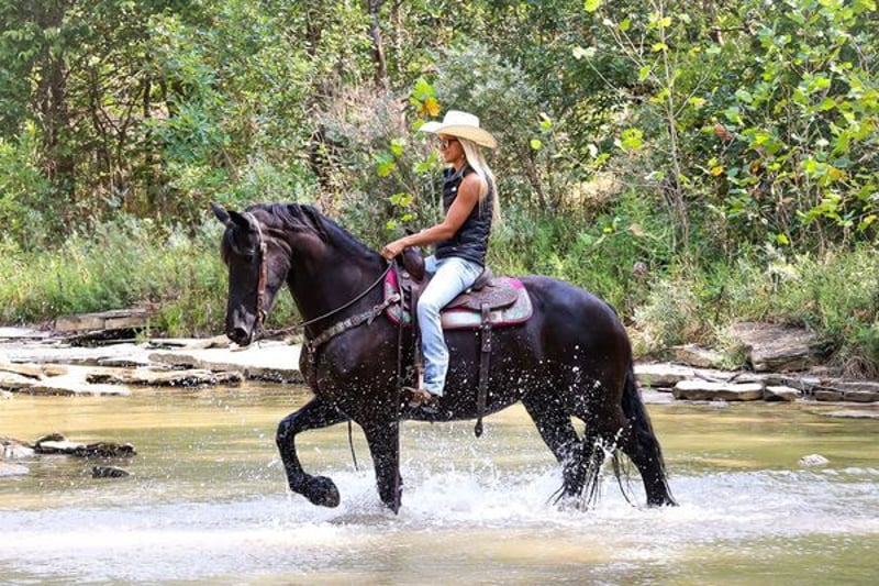 Alexis is a gorgeous, well made, Black ranch and trail gelding! Alexis comes to you in his stall or turn out and wants to be loved on. He has a ton of outside miles! Overnight camping, trail ridding state parks and western dressage training! Alexis is so much fun! He has a great stop, smooth jog and a nice short lope! He is an excellent trail riding horse, great in traffic and commotion. He is easy to catch, lead, load, haul, stands tied, bathe, groom, pick feet, saddle, bridle, and quiet for the vet and farrier. Stands for mount and dismount, rides in just a loose ring snaffle, a short shank snaffle, or a full bridle. He has a nice neck rein or direct rein, picks up both of his leads, backs up, side passes, and works a gate. Watch his video and check out all his pictures, no one has walked by this guy and not made a comment about him, he is huge, stout, and just stunning! He has an adorable, in your pocket, puppy-dog personality that you cannot help but fall for. He is absolutely stunning and a big sweet gentle boy.