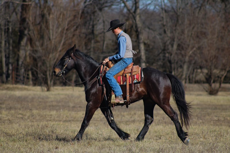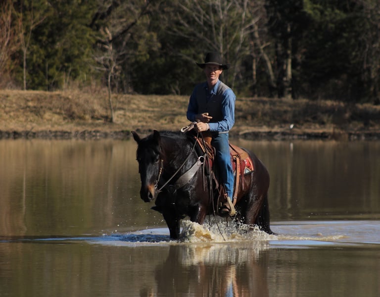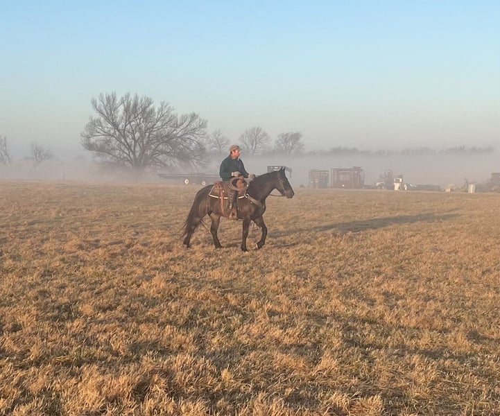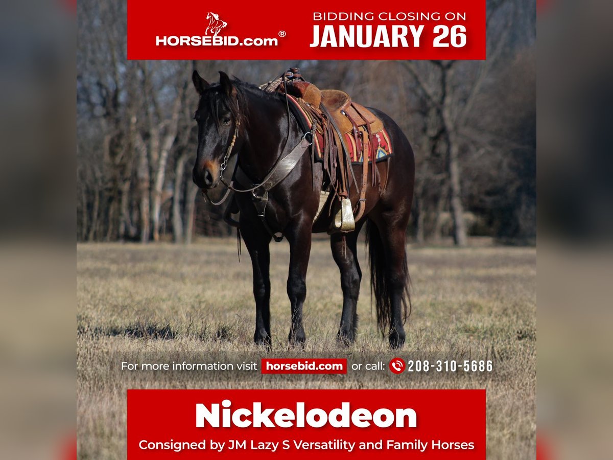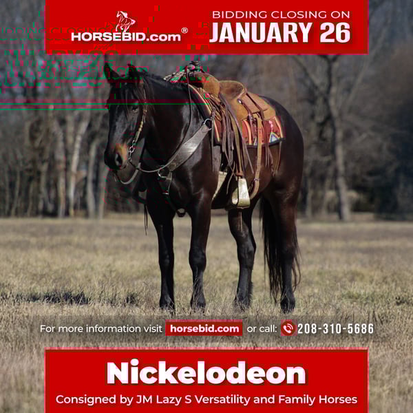 𝐉𝐀𝐍𝐔𝐀𝐑𝐘 ⭐️𝑨𝒍𝒍 𝑺𝒕𝒂𝒓 𝑳𝒊𝒏𝒆𝒖𝒑⭐️ Happening now thru MONDAY | JANUARY 26th - Available EXCLUSIVELY on HorseBid's website! For more details and to register visit: www.Horsebid.com CONSIGNOR CONTACT: JM Lazy S Versatility and Family Horses 208-310-5686 LOCATION: Baxter Springs, KS BREED: Percheron Crossbred (Sporthorse) REGISTERED: Yes REGISTERED NAME: Rock Lane Nick COLOR: Dark Bay HEIGHT: 15.3 AGE: 4 GENDER: Gelding Rock Lane Nick affectionately called Nickelodeon is a 2022 15.3-hand registered Percheron cross gelding (50% Quarter Horse / 50% Percheron) that is as enjoyable to be around as he is talented under saddle. Home raised and with us since he was a yearling, Nick is the kind of horse everyone hopes to find—kind, silly, people-loving, and genuinely eager to please. Nick is a nice young horse, that has been given a thoughtful, correct start and shows a remarkably good brain and personality for his age. He has a naturally balanced way of going with an easy, comfortable lope, smooth transitions, and a big, quality trot that’s fun to ride. He’s been used for all the ranch chores, is solid on the flat, and has been started over ground poles and small cross rails, showing a willing and uncomplicated approach. Before starting his riding career, he was also driven in a team for a short period, giving him an extra layer of experience and confidence. He’s a great trail partner as well—good over water, logs, brush, and bogs, and has been out on group trail rides where he stays sensible and confident. Nick is naturally curious and willing, preferring to think things through rather than react, which makes him easy to develop and enjoyable to ride as he continues to mature. On the ground, Nick is a total gentleman. He’s easy to catch, good to shoe, stands quietly for blanketing, saddling, and bridling, loads easily, and is happy in a stall. He’s been exposed to all the “silly stuff” and takes it in stride—flags, tarps, sleds, dogs, pigs, goats, and general chaos don’t bother him. He sidepasses nicely to a mounting block or fence for easy mounting and aims to make his rider comfortable. With his size, bone, athletic ability, and golden personality, Nickelodeon is a versatile, fun gelding with a fabulous foundation and a bright future ahead. A truly special young horse with the brain and heart everyone is looking for. He’s up to date on dental, chiropractic care, worming, farrier care and coggins. Call or Text John (208)310-5686 for more information about Nickelodeon.