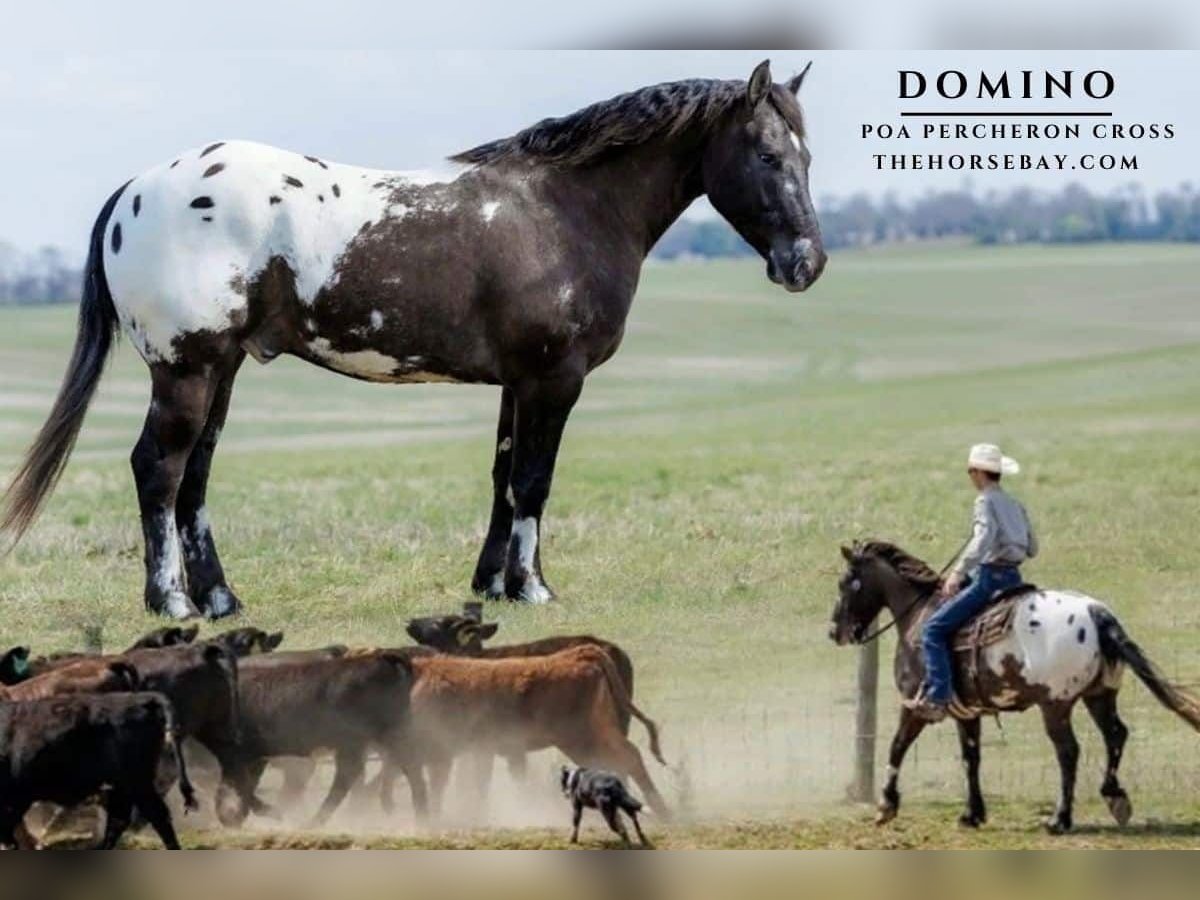 Make a statement with DOMINO! He’s unique and eye-catching! A rare cross loaded with talent & color! Domino is a 5-year-old POA/Percheron cross gelding, standing 14.2 hands. A reliable trail partner & an honest ranch hand. He offers a sturdy build paired with a fun and upbeat disposition. On the trail, Domino is a confident, point-and-go type that has been enjoyed by my teenage daughter. He is sure-footed and dependable. He navigates uneven, rocky terrain without hesitation, crosses deep water, mud, bridges, and travels up and down inclines. A strong, capable companion for those who like to explore the countryside. In the arena, Domino travels both directions on the correct lead & moves laterally. He has been put to work at the stockyard penning and sorting cattle, as well as gathering and sorting on the farm alongside stock dogs. Opens and closes gates with ease and is no stranger to a day’s work. Nothing seems to phase him, he carries the flag, unbothered by the tarp, and is comfortable around traffic, ATVs, UTVs, farm equipment, dogs, and other livestock. Domino has a friendly personality and is always easy to catch. He loads and hauls without issue, can be stalled or live outside, and fits nicely into a mixed herd. With great feet, he’s currently barefoot and maintained on a regular trim schedule. From the farm to the trail, Domino is a solid, dependable partner that’s ready to go in any direction. If you want a handsome, capable gelding that will get you noticed while staying safe, this is your guy. Domino sells sound, healthy, & current on all cares. If you have any other questions or would like to meet Domino, feel free to reach out!