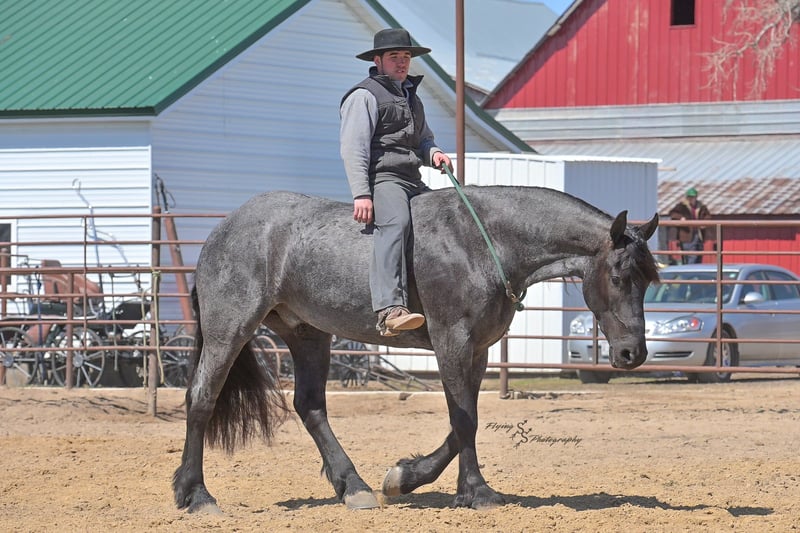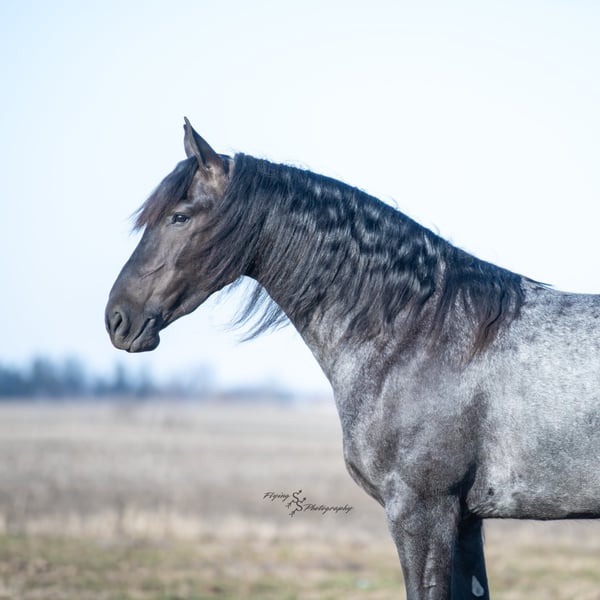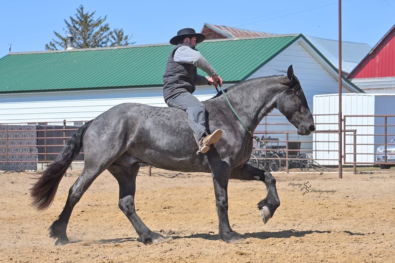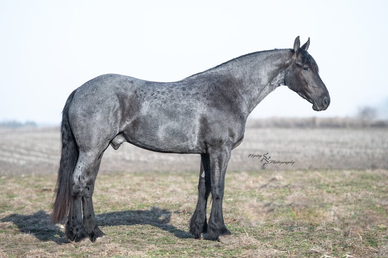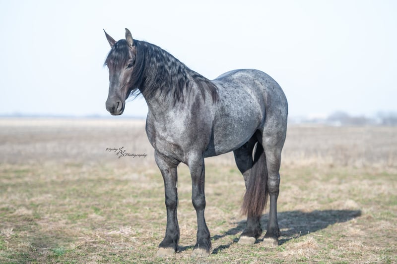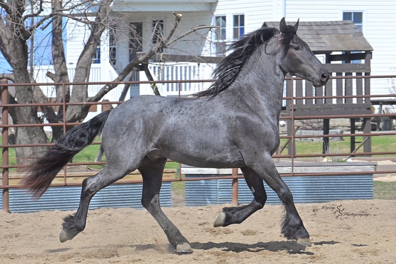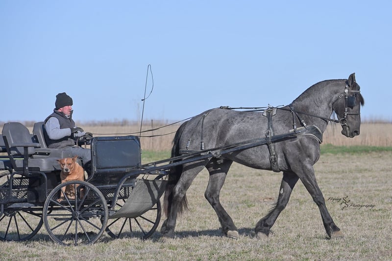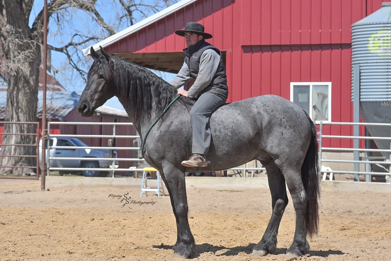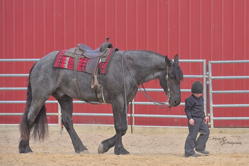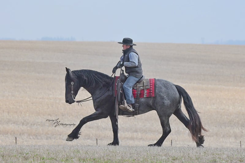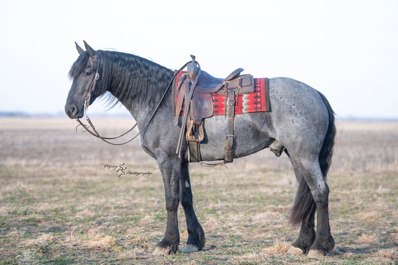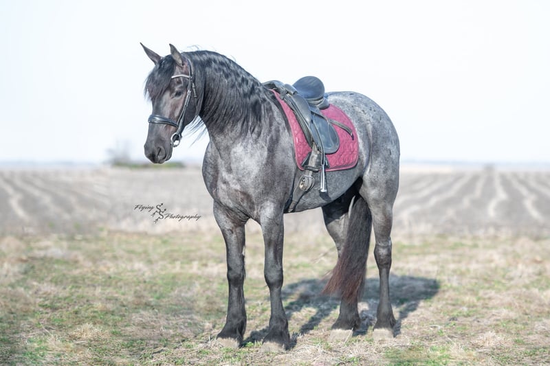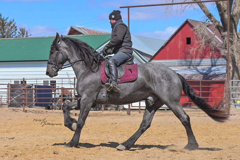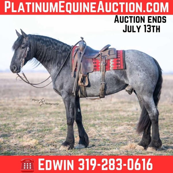 ONLINE AUCTION Place your bids at www.PlatinumEquineAuction.com Starting Bid $3500 Auction ends July 13th 2025 Need a new saddle? Check out White Rock Saddles on our website or Facebook! A. Tyler T. is a true blue roan, 16h, registered Friesian Heritage and Sporthorse International gelding. He has the color, class, and conformation; this nice young gelding checks every box. He is 16h, 75% Friesian and 25% Quarter Horse which has packed him with athleticism as well as elegance. Tyler has had a lot of versatility in his training. He rides western, English, bareback, bridleless, and drives! His riding, disposition, and overall maturity are out of this world for his age. Tyler takes pressure extremely well, especially for only being 4 years old. He has such a solid foundation. Tyler enjoys working in the arena, as well as spending time out on the trails and going through the obstacle course. He is very quiet on the trails and has been exposed to wildlife, downed timber and water. He is traffic safe when riding or driving and has even been to the parks in town! If you’re searching for a young, fancy gelding with the drive to be a performance horse backed by the disposition to be an in your pocket, best friend…. Tyler is who you need in your barn. He is comfortable around small children. We have led him with the kids in the saddle and even turned him loose with the youngsters in a controlled environment. Tyler also does well around other horses, livestock, and small pets, nothing phases him. He does wonderful in a stall or in a pasture setting and is easy to catch. Anyone with riding experience will get along well with him. Tyler is an honest individual! He lopes beautiful, correct circles, picking up his leads on cue. Tyler also has a very nice extended trot! He is a horse that is happy to work for you and truly aims to please. In the arena, Tyler is showing a lot of natural ability in dressage. He has the power and class to excel in that discipline. Tyler also looks beautiful and performs well in western tack! He also looks like royalty when hitched to a carriage. At such a young age, and with the foundation of training that he has had, the sky’s the limit for him. Tyler stands at a mounting block to be mounted and stands cross tied to be tacked up. He is an absolute gentleman for the veterinarian and farrier. Tyler is extremely gentle on the ground and loves attention, making him easy to handle. I have no complaints about this excellent gelding, and have no doubt that whoever buys him, will love him. He will come with a PPE on file and current coggins. If you would like radiographs, I am happy to assist with that. If you would like to meet Tyler or have any questions prior to the auction ending, please call Edwin Raber 319-283-0616. Located in Fairbank, IA, we invite anyone to come see him in person and spend some time with us! ONLINE AUCTION Place your bids at www.PlatinumEquineAuction.com Starting Bid $3500 Auction ends July 13th 2025 Need a new saddle? Check out White Rock Saddles on our website or Facebook!