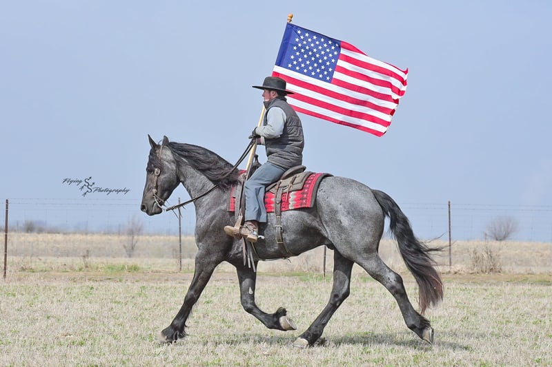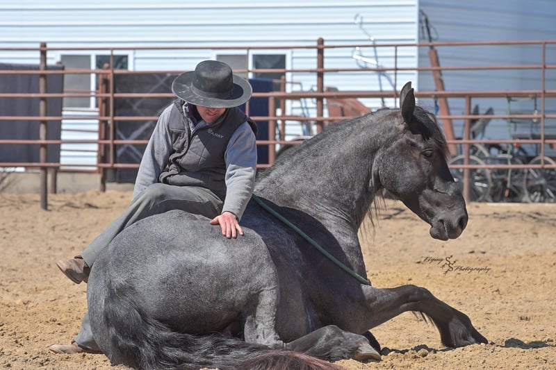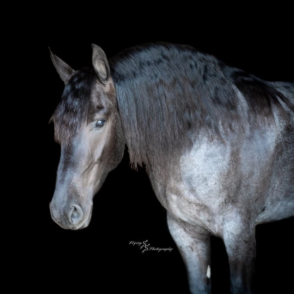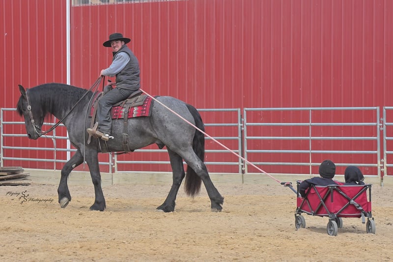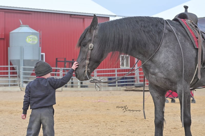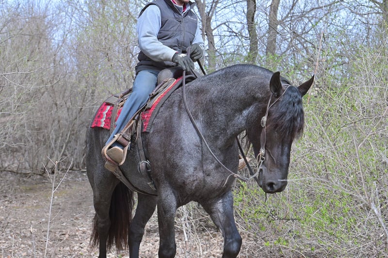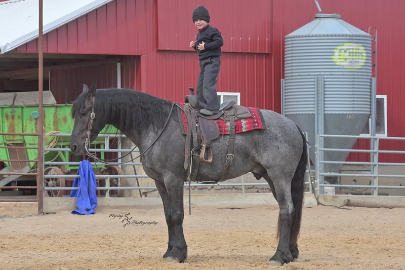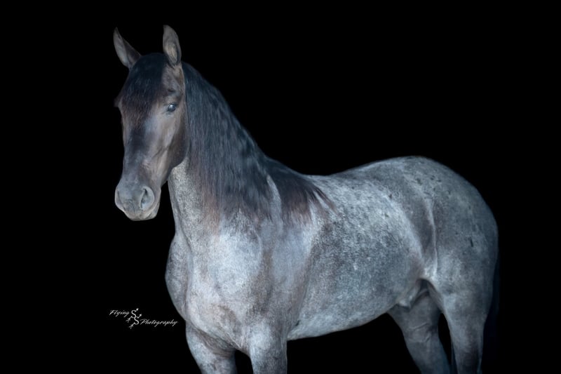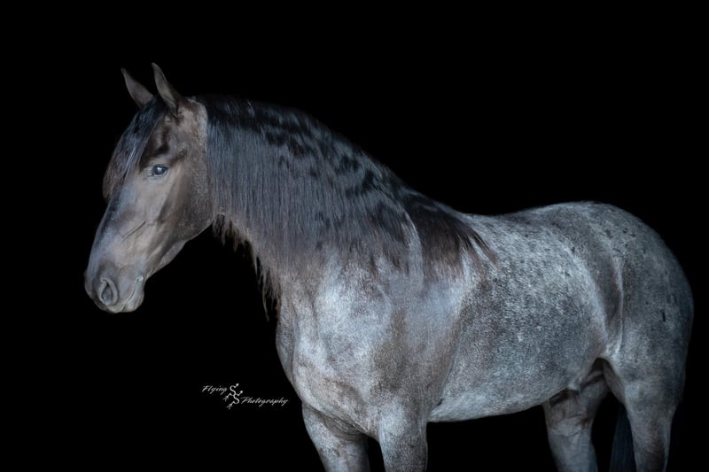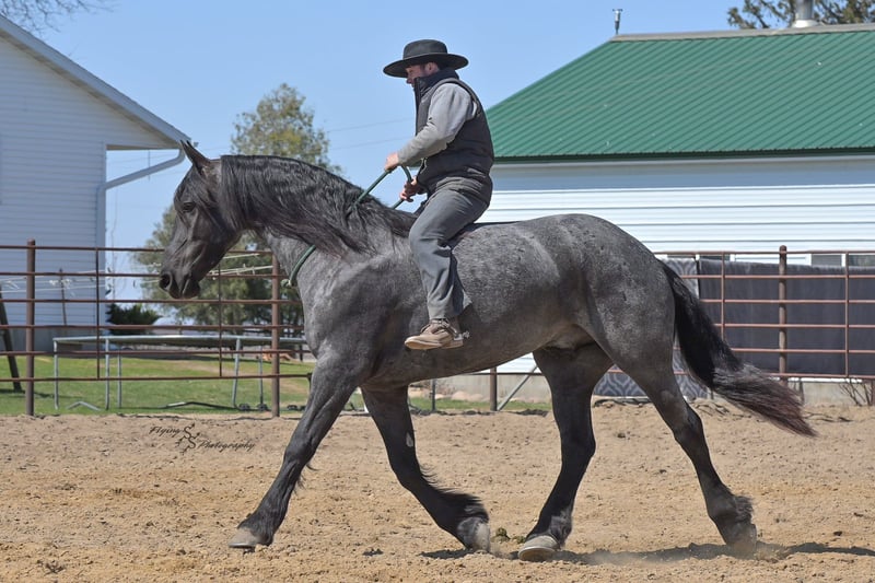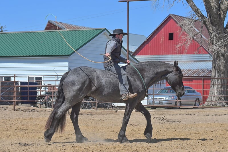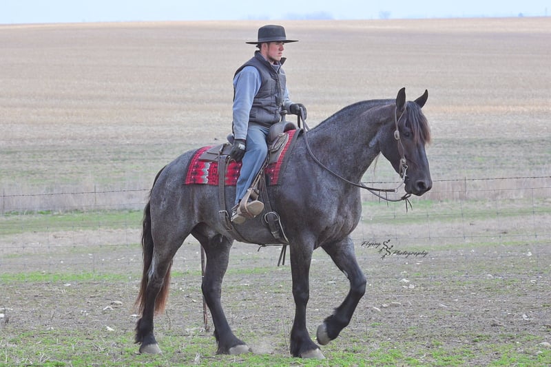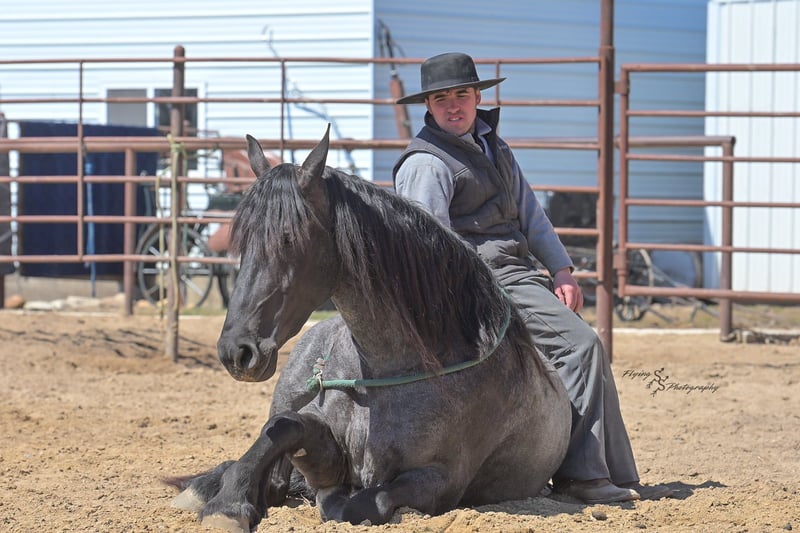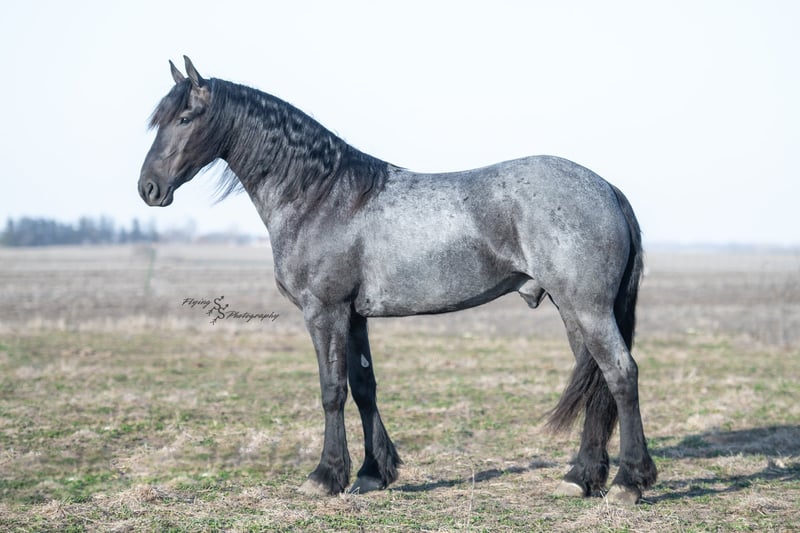 ONLINE AUCTION Place your bids at www.PlatinumEquineAuction.com Starting Bid $3500 Auction ends July 13th 2025 Need a new saddle? Check out White Rock Saddles on our website or Facebook! A. Tyler T. is a true blue roan, 16h, registered Friesian Heritage and Sporthorse International gelding. He has the color, class, and conformation; this nice young gelding checks every box. He is 16h, 75% Friesian and 25% Quarter Horse which has packed him with athleticism as well as elegance. Tyler has had a lot of versatility in his training. He rides western, English, bareback, bridleless, and drives! His riding, disposition, and overall maturity are out of this world for his age. Tyler takes pressure extremely well, especially for only being 4 years old. He has such a solid foundation. Tyler enjoys working in the arena, as well as spending time out on the trails and going through the obstacle course. He is very quiet on the trails and has been exposed to wildlife, downed timber and water. He is traffic safe when riding or driving and has even been to the parks in town! If you’re searching for a young, fancy gelding with the drive to be a performance horse backed by the disposition to be an in your pocket, best friend…. Tyler is who you need in your barn. He is comfortable around small children. We have led him with the kids in the saddle and even turned him loose with the youngsters in a controlled environment. Tyler also does well around other horses, livestock, and small pets, nothing phases him. He does wonderful in a stall or in a pasture setting and is easy to catch. Anyone with riding experience will get along well with him. Tyler is an honest individual! He lopes beautiful, correct circles, picking up his leads on cue. Tyler also has a very nice extended trot! He is a horse that is happy to work for you and truly aims to please. In the arena, Tyler is showing a lot of natural ability in dressage. He has the power and class to excel in that discipline. Tyler also looks beautiful and performs well in western tack! He also looks like royalty when hitched to a carriage. At such a young age, and with the foundation of training that he has had, the sky’s the limit for him. Tyler stands at a mounting block to be mounted and stands cross tied to be tacked up. He is an absolute gentleman for the veterinarian and farrier. Tyler is extremely gentle on the ground and loves attention, making him easy to handle. I have no complaints about this excellent gelding, and have no doubt that whoever buys him, will love him. He will come with a PPE on file and current coggins. If you would like radiographs, I am happy to assist with that. If you would like to meet Tyler or have any questions prior to the auction ending, please call Edwin Raber 319-283-0616. Located in Fairbank, IA, we invite anyone to come see him in person and spend some time with us! ONLINE AUCTION Place your bids at www.PlatinumEquineAuction.com Starting Bid $3500 Auction ends July 13th 2025 Need a new saddle? Check out White Rock Saddles on our website or Facebook!
