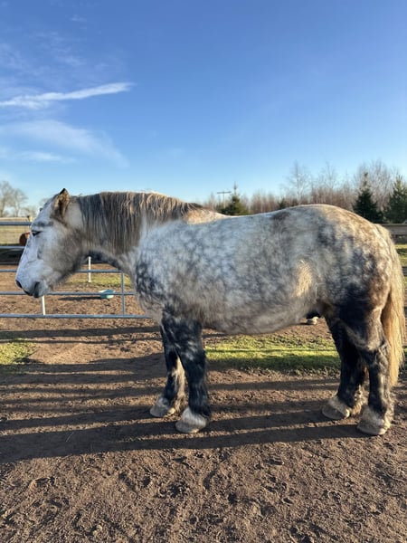 For Sale: Beautiful Percheron Gelding We are offering an impressive Percheron gelding, born in 2019. This elegant black and white pinto stallion measures 16.1 hh and impresses with his strong build and calm, friendly demeanor. He is ideal for leisure riding and delights with his pleasant temperament and versatility. The horse is healthy, regularly groomed, and experienced in handling with children, teenagers, and adults. He is perfectly suited for riders seeking a reliable and confident leisure horse. After gentle bitless training, he was primarily used 3-4 times a week as a therapy horse. Changing clients was never an issue. He undoubtedly impresses with his size, calmness, and balanced nature. I also see Ferdinand in the driving discipline. However, I cannot offer him this activity and am reducing my herd for personal reasons. If you are interested or have further questions, please do not hesitate to contact me. Feel free to arrange a viewing and a test ride!