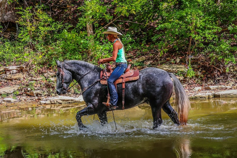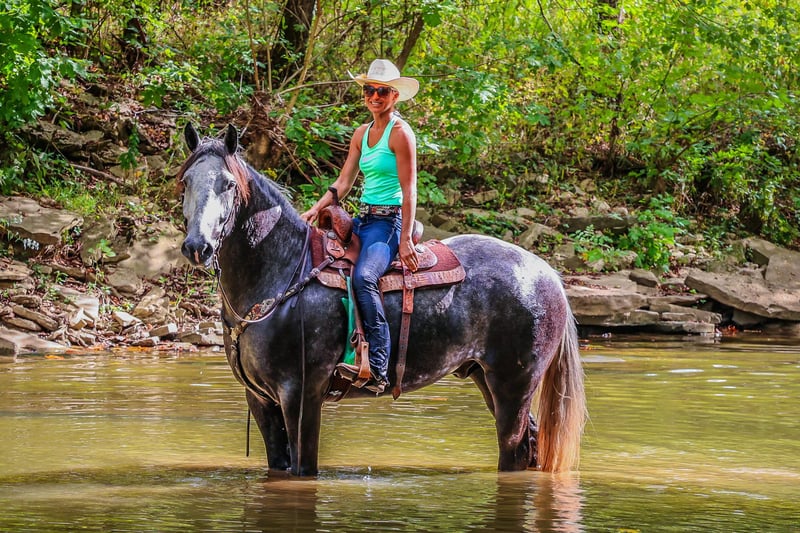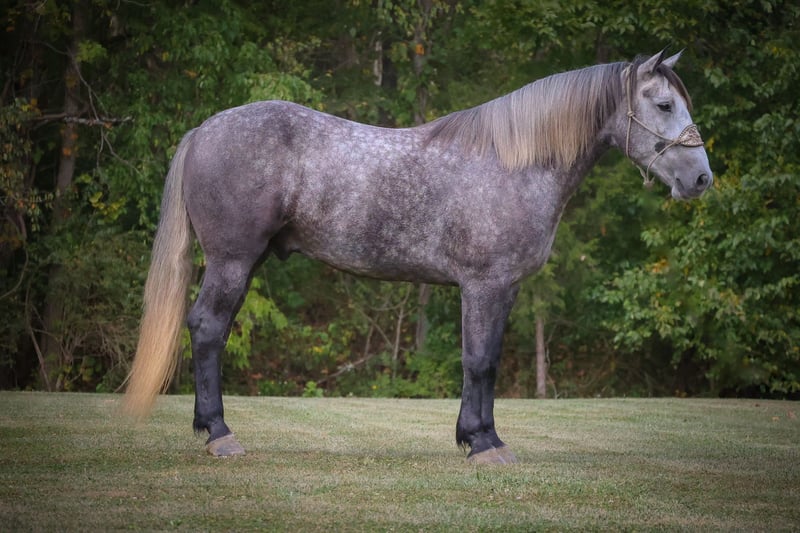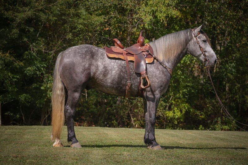 ONLINE AUCTION Place your bids at www.PlatinumEquineAuction.com Starting Bid $3500 Auction ends October 6th, 2024 Need a new saddle? Check out White Rock Saddles on our website or Facebook! This is “Austin”, A GREAT MINDED, PROFESSIONALLY TRAINED, and GENTLE DAPPLE GRAY PERCHERON QUARTER HORSE CROSSBRED GELDING. This gelding is broke to ride and drive. He stands 16.3 hands tall and is 5 years old. This gelding is a gorgeous steel gray with big dapples all over him. He has been used for ranch work and is handy, athletic, responsive, and obedient. He will sit down and turn around, stop easily on whoa, back up for ANY distance, and he moves off of leg and seat cues. This gelding stands to harness, hitch, tack, mount, and groom. He has excellent ground manners, he is not spooky, and he is traffic safe. He will lope and jog nice circles, he catches his leads, and will one step lope. He rides and drives collected, calm, and cool. He has been on cross country wagon rides and will go through the deep water quietly and he will go up and down the steep hills relaxed. He won’t go any faster than you ask of him and he is not chargy. He is patient, kind, and willing. He will ride out alone with no problems and also rides in a large group. He has been on camping trips at state parks and will stand tied overnight. He is everything you want all in one package. He has the size, the build, the look, the color, the brains, the ability, the training, and the attitude that will make you happy. He is good with all other horses and unloads in new surroundings quietly. He is fun to ride, easy to drive, and has a head full of sense. Located in Flemingsburg, KY. Contact HH Horses Erin 304-238-4155. ONLINE AUCTION Place your bids at www.PlatinumEquineAuction.com Starting Bid $3500 Auction ends October 6th, 2024 Need a new saddle? Check out White Rock Saddles on our website or Facebook!