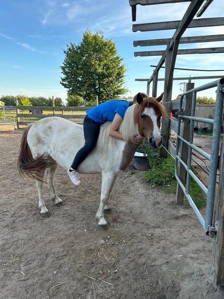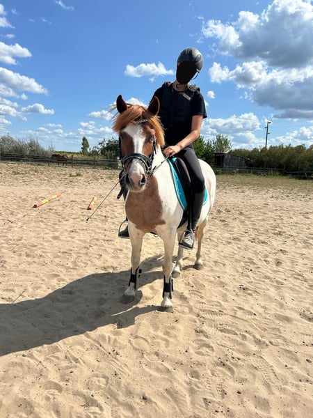 Hello, I am Pauline Blue Eyes, but you can call me Xanti. I am a Pinto mare, approximately 1.33 m tall, born in 2015, making me 10 years old, and I have a chestnut coat with white markings. I am familiar with being in a box, but I currently live in a mixed herd in a paddock, and I would prefer to stay that way. I get along fine with Shetlands or larger horses; I am rather low in the hierarchy and adapt to any situation. I am looking for my person, someone with time and patience for me. Sometimes I can be a typical pony with a stubborn streak and prefer to do my own thing. On other days, I am very sweet and allow myself to be lunged and ridden at the walk, trot, and canter. I generally enjoy jumping. Since my current family has little time for me and I really need regular training, with assertiveness yet a lot of calm and love, they have made the difficult decision to find a new, experienced home for me where I can receive the attention I seek and need. The farrier is no problem for me (barefoot), I enjoy being groomed, and I willingly go into the trailer. Here, I have hay 24 hours a day and pasture in the summer. Leading along the road, tractors, trucks, and motorcycles are not an issue for me. Generally, I am quite fearless and go in and through everything. Therefore, I also need a securely fenced paddock and a pasture with electric fencing. That should generally be the case, but I prefer to mention it again. For further questions, please feel free to contact my family at 0172 53 63 327. I look forward to meeting you!